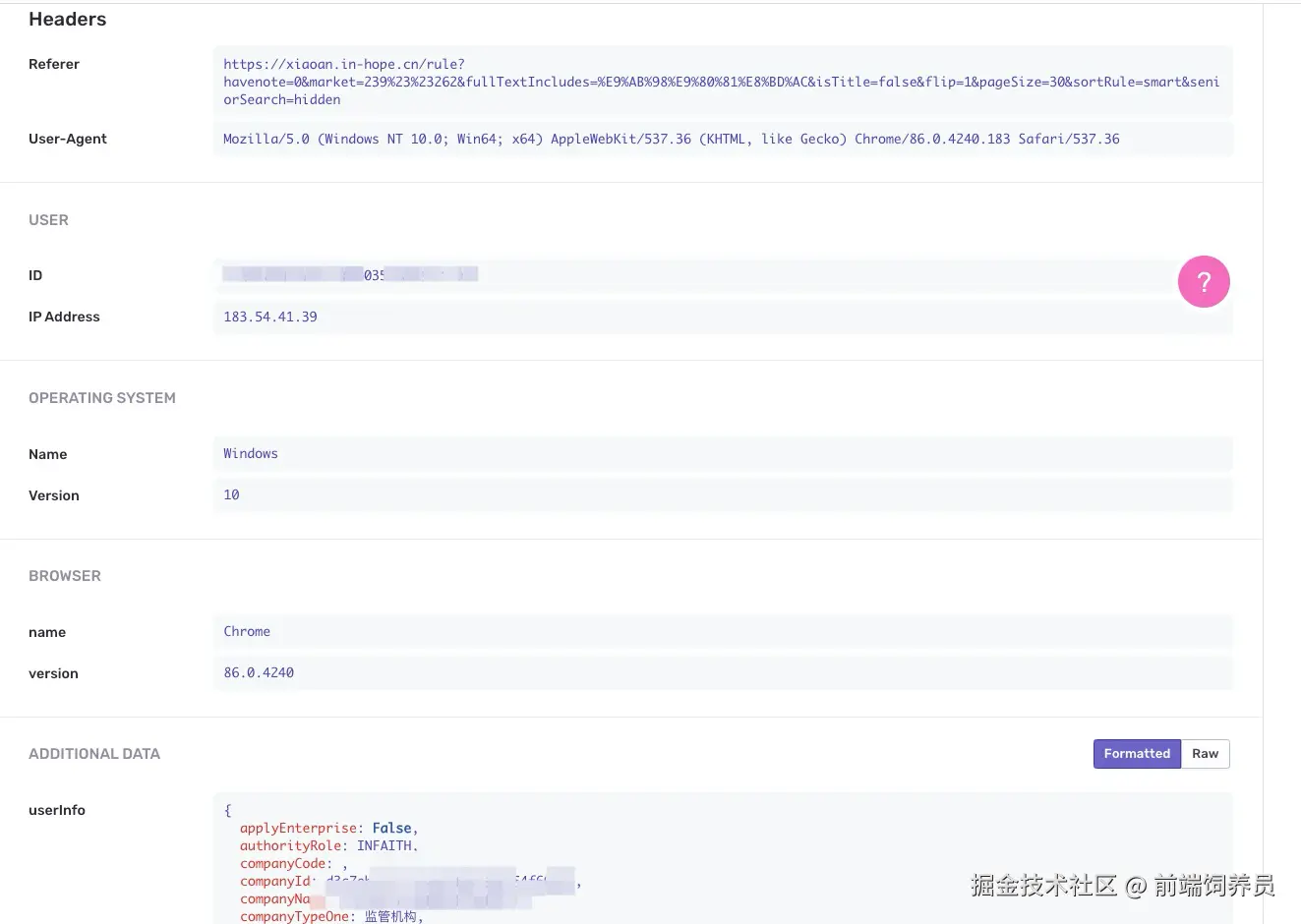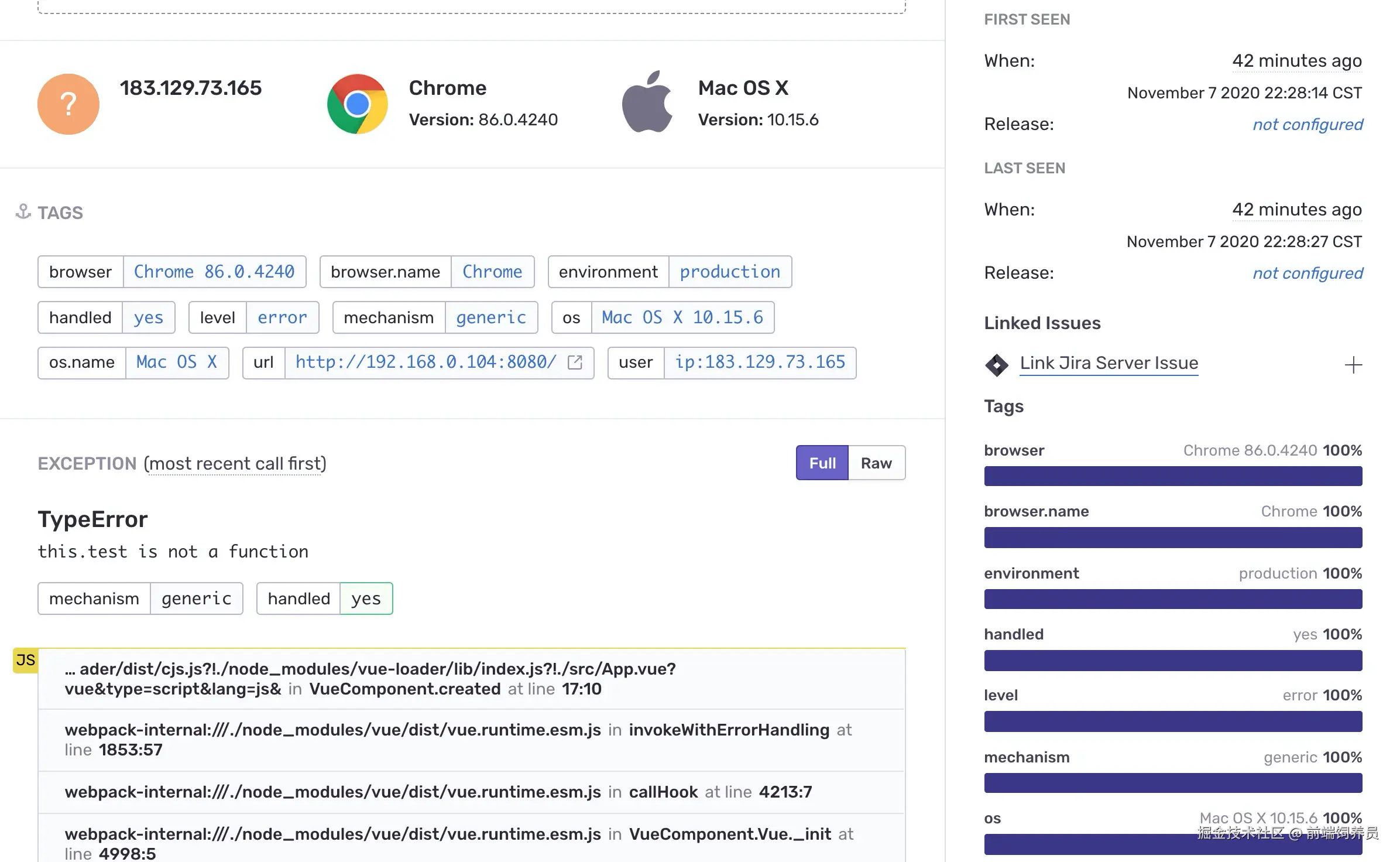 点击进入到 Issue 详情页面,在页面中间区域,你可以看到最近一次 Event 的具体信息,如用户的 IP 地址、浏览器信息、系统信息、异常调用栈信息等。