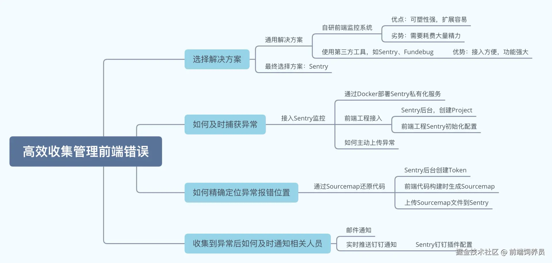 以上就是使用 Sentry 这个工具收集异常的全过程了,我做了一张思维导图来帮助你更好地消化这一期的内容。