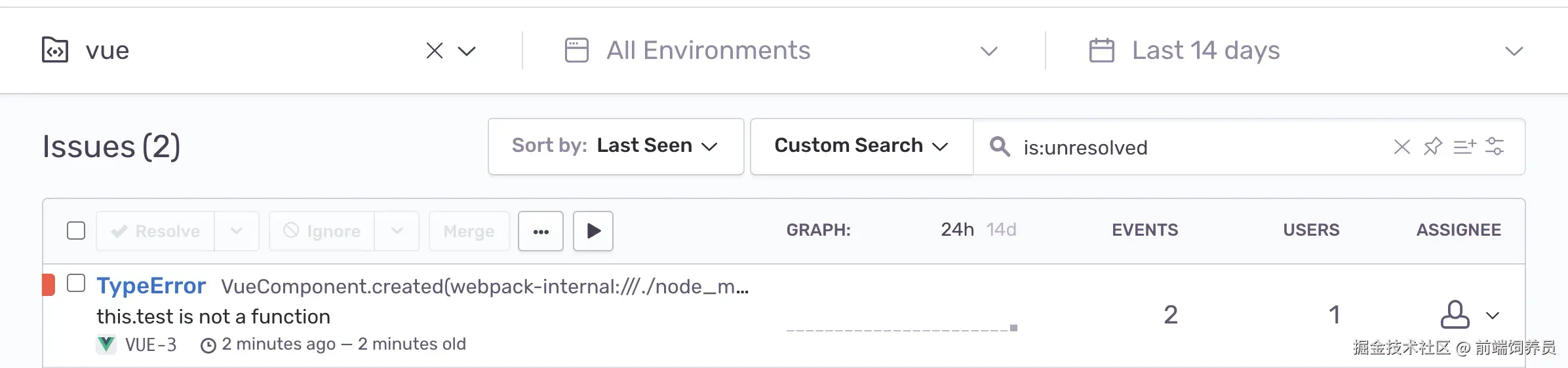 首先我们在 App.vue 的 created 方法内增加一行代码:this.test(),来调用一个当前组件内不存在的方法,强行产生一个 JS 报错。通过 Chrome DevTools 内的 Network,我们可以看到每次页面刷新后,都会有一个 Sentry 相关的 Post 请求发出,这是 Sentry 在收集异常信息。这时候再去看 Issue 报错页面,我们发现 Sentry 已经将捕获到的异常展示出来了: