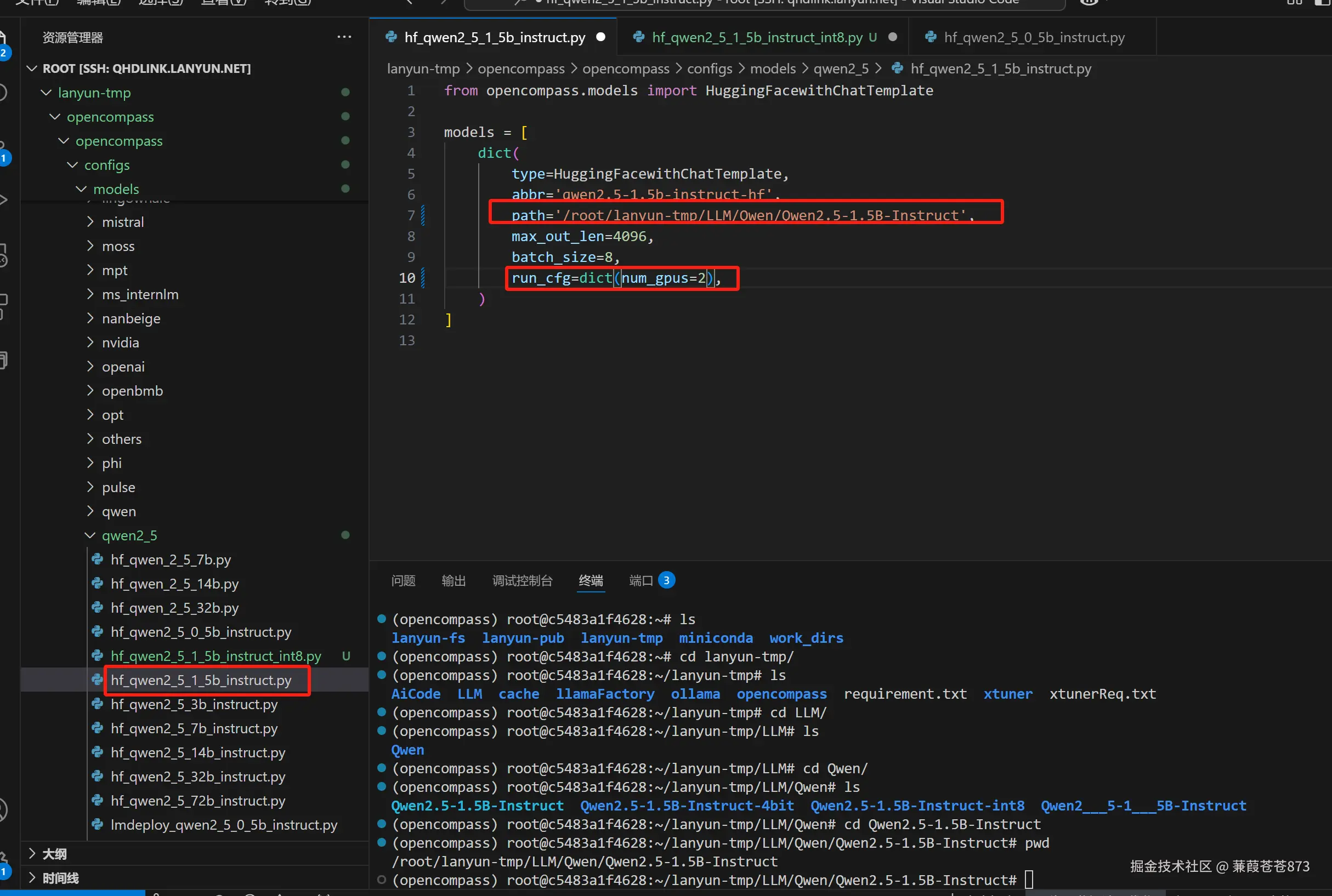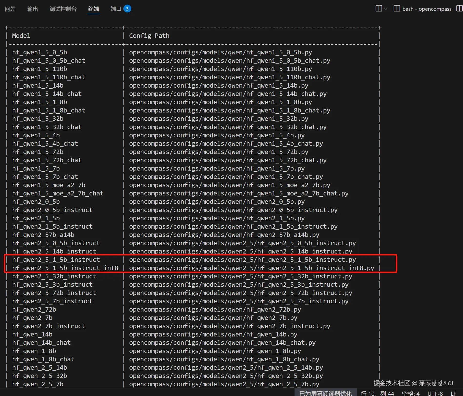 通过这个命令就可以筛选出来目前opencompass的框架下面所支持的所有的HuggingFace的千问系列的模型名称。因为hf_qwen是个模型的前缀,所以它会输出hf_qwen的所有模型的名称,