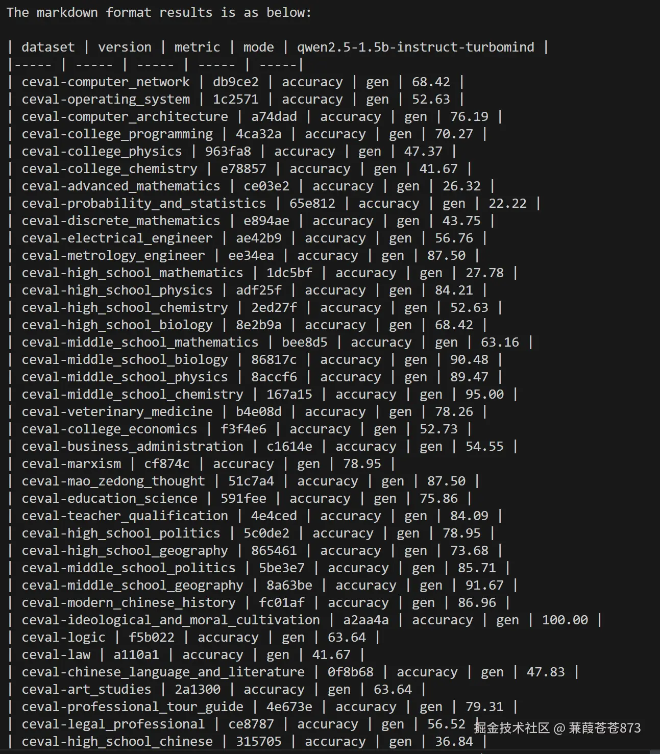 - 生成质量(GEN): 通过文本生成结果提取答案,需结合后处理脚本解析输出。使用gen类型的数据集(如ceval_gen),配置metric=gen并指定后处理规则。