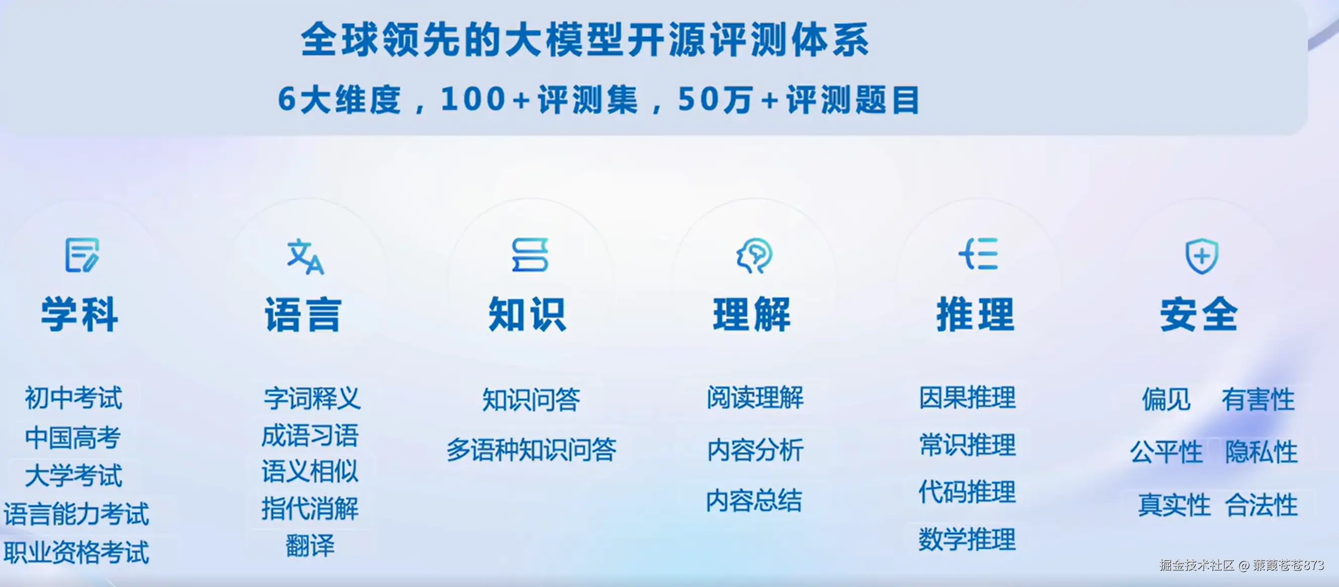 OpenCompass内置超过100个数据集,覆盖五大能力维度:
