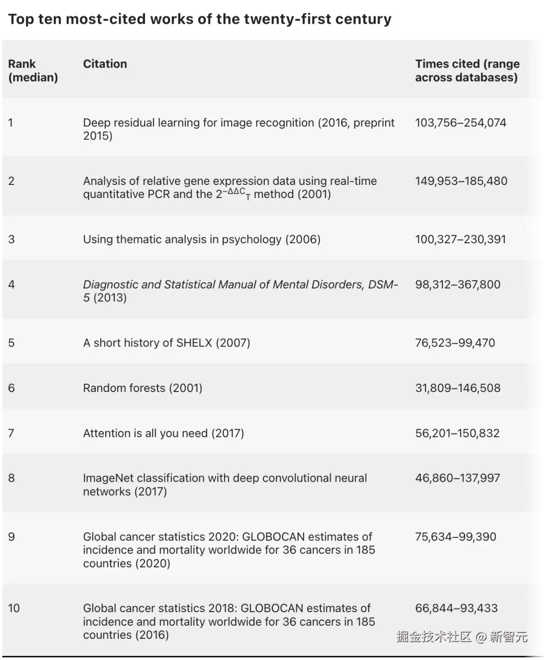 _Nature 的_分析基于五个学术数据库(涵盖了 21 世纪数千万篇论文),通过取中位数排名,筛选出本世纪最受引用的 25 篇论文。
