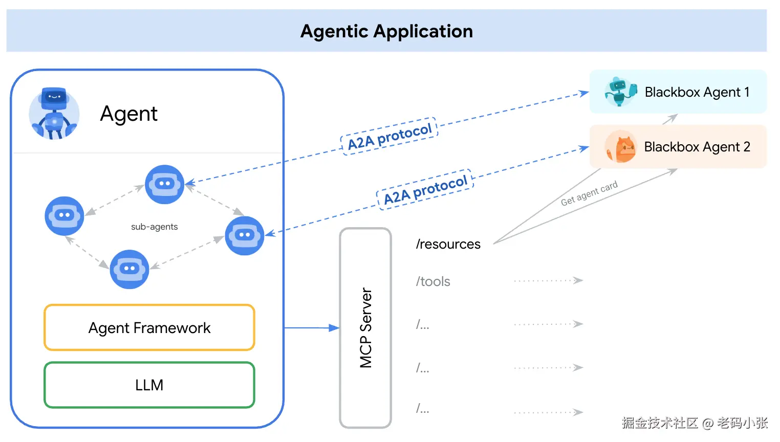 AgentCard。 - 切换协议: 当主 Agent 决定需要与某个 A2A Agent 进行复杂的协作(而不是简单的工具调用)时,它就根据