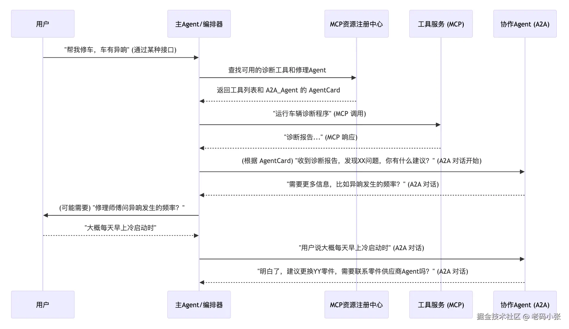 - 用户与 Agent 交互: 你(用户)对 AI 修理工说:“我的车发出嘎啦嘎啦的响声。” 这不是一个结构化指令,需要对话来 уточнять 问题。AI 修理工可能会问:“能发一张左前轮的照片给我吗?”、“我注意到有液体泄漏,这种情况持续多久了?” 这种持续的、信息不断补充和计划不断调整的对话,就是 A2A 发挥作用的地方。