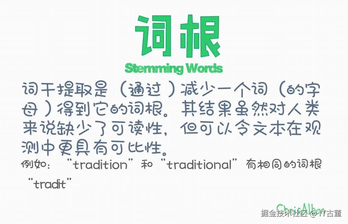 图中的例子简明直观地说明了词干提取的本质:不追求完整语义,而注重形式上的统一。这种“牺牲可读性,换取可比性”的方式,正是现代 NLP 实用主义精神的体现。