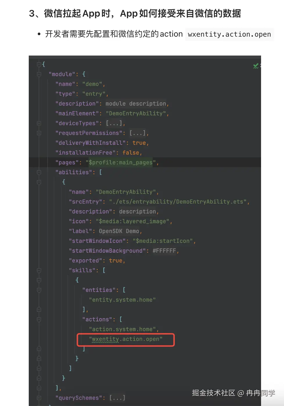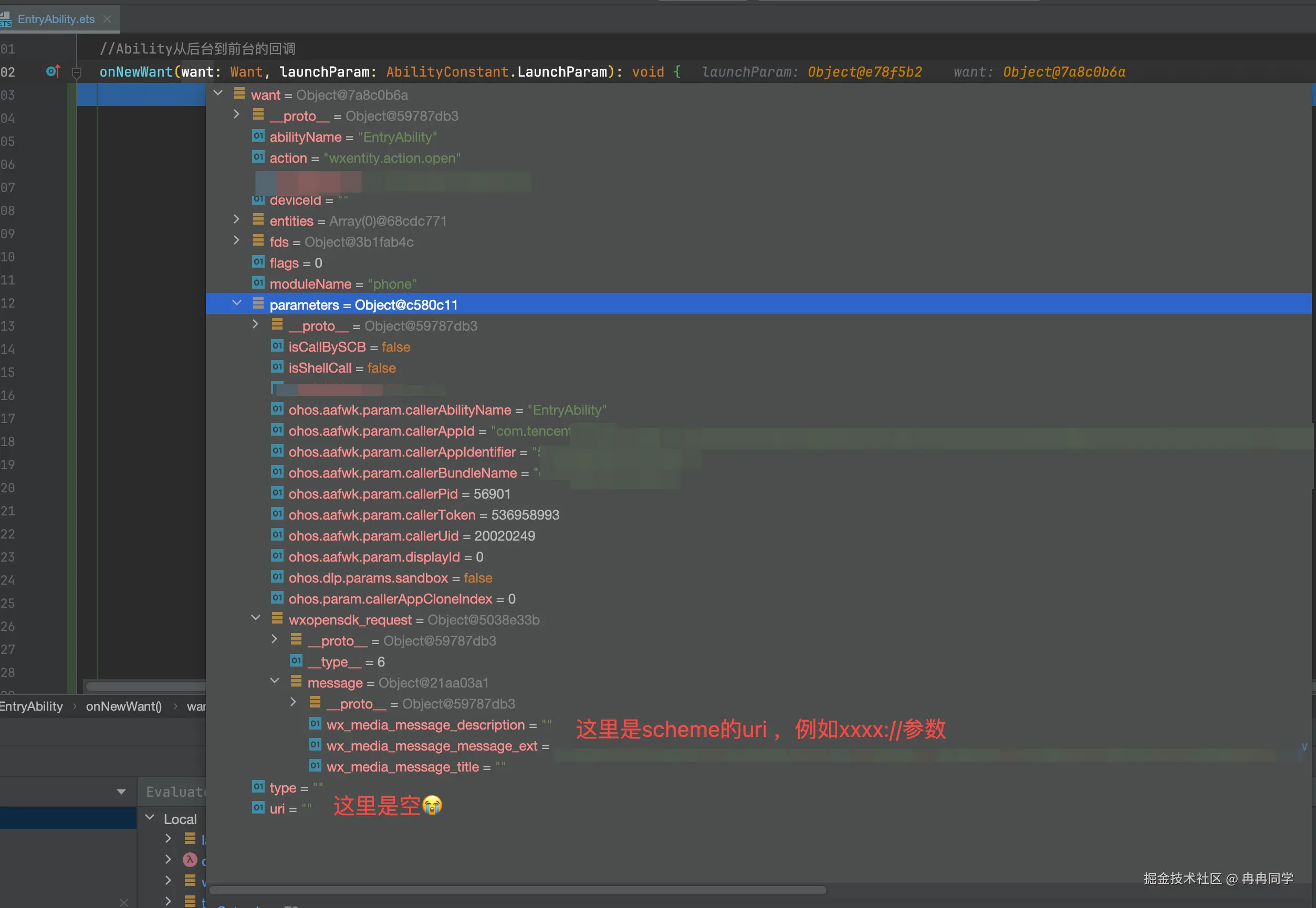 开始怀疑是不是微信有BUG,或者鸿蒙版微信有白名单机制,但是尝试了微博和小红书,是可以唤起APP的,于是开始尝试在各种鸿蒙论坛和说说引擎中搜索,未发现有人遇到此类问题,o(╥﹏╥)o,直到我把微信的鸿蒙应用开发手册反复看了十遍,直到看到一句话【微信拉起App时,App如何接受来自微信的数据】