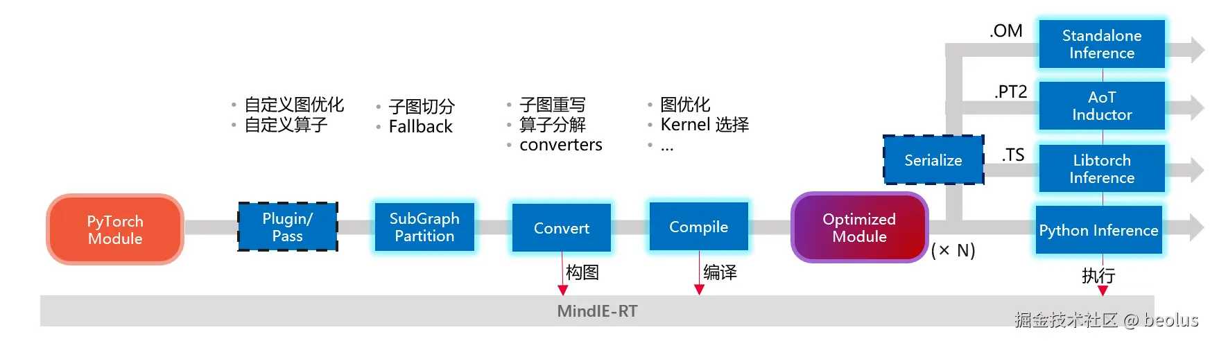 - torch.compile 路线 提供了名为mindie的编译后端,支持在推理时对torch.compile; 生成的GraphModule进行即时编译优化。