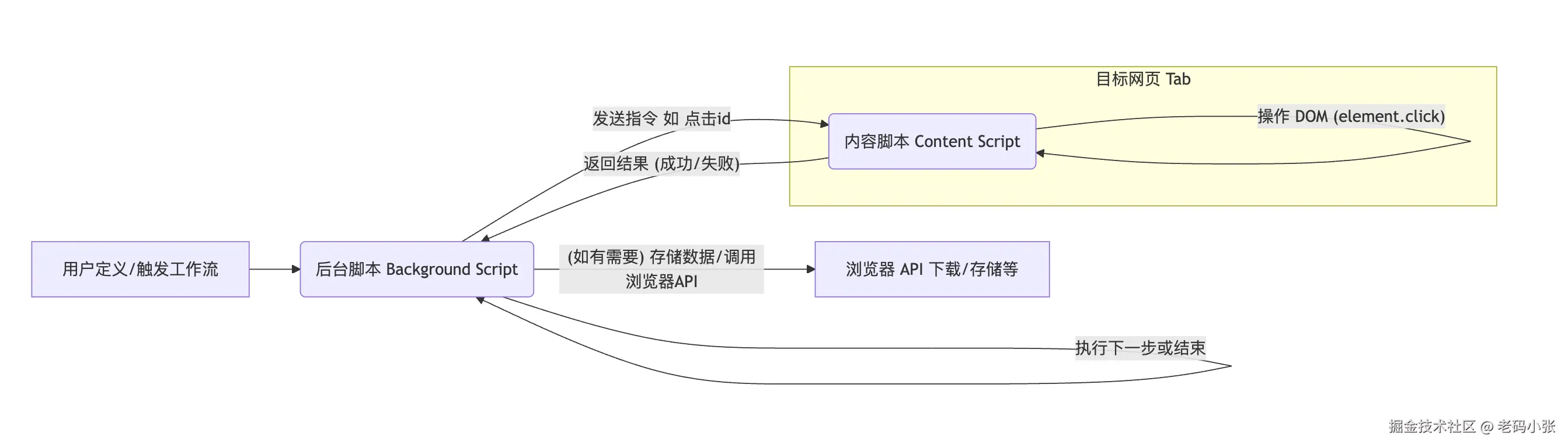 element.click()方法。 - “填写表单”块: 内容脚本找到表单输入框元素,设置其
