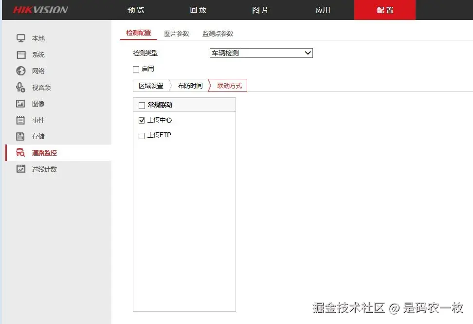 6)在相应的报警事件联动方式中,勾选“上传中心”选项,即可完成配置。