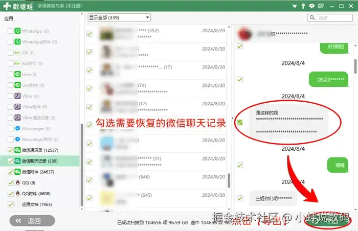2、扫描完成后,在左侧菜单选择“微信聊天记录”,预览并勾选目标记录,点击“导出”。