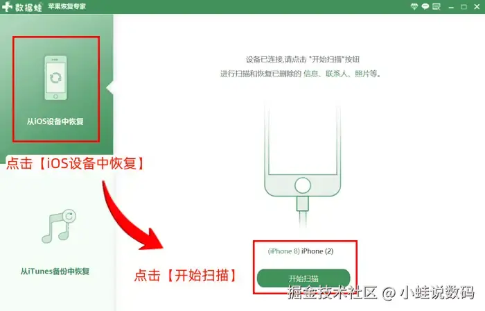 1、电脑上下载并安装可信赖的数据恢复软件:数据蛙苹果恢复专家,打开运行恢复软件,选择“从iOS设备中恢复”或类似选项,点击“开始扫描”。