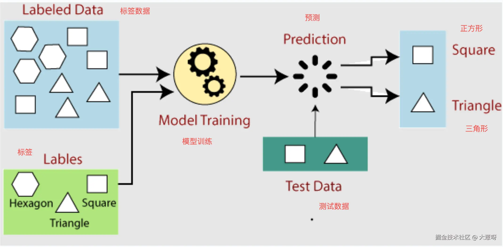 Prediction(预测): :模型使用从训练数据中学到的规则来预测测试数据的标签。在图中,模型预测了测试数据中的正方形和三角形。