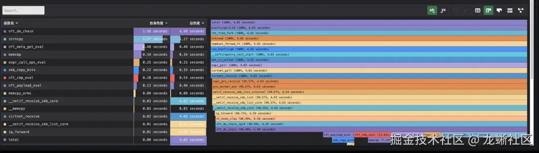 某客户反馈业务网络偶发超时,通过查看进程热点追踪,发现热点在nft_do_chain。下图是热点追踪显示某个时刻网络超时时的函数表和火焰图。