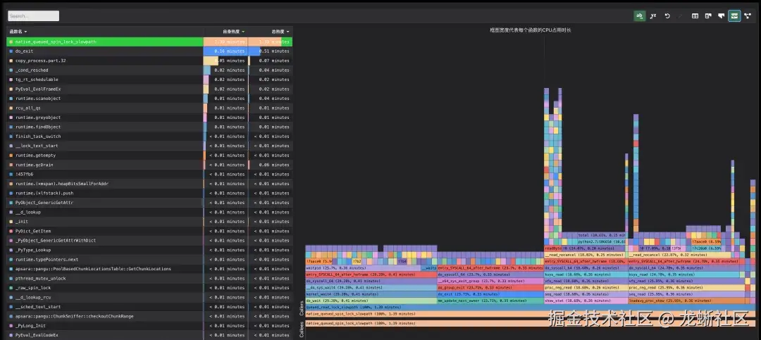 从下面的 CPU 热点分布图上,我们能够看到,在 CPU 热点图在 14:15 附近有突增,和 load 飙高的时间点基本吻合。