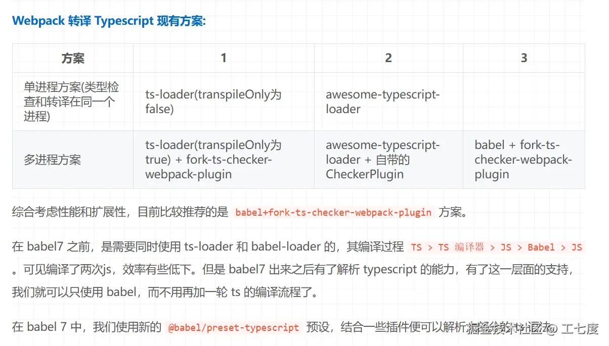 Babel,安装@babel/preset-typescript,配合tsc做类型检查。 - 两种编译器不要混用。