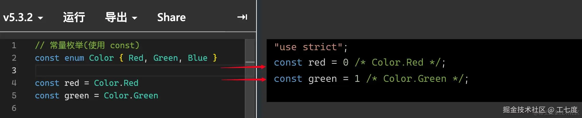 enum A {...}, 会将其编译为一个JS对象, 对象内就是枚举成员和值的一个相互映射,常量枚举const enum A {...}, 编译后不会生成任何代码, 会删除TS部分内容, 对于使用到的成员只会进行值的替换 - 由此可见, 使用