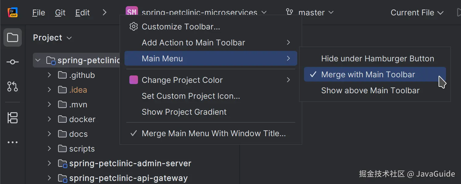 对于 Windows 和 Linux 用户,IDE 现在提供了一个新选项,将主菜单与主工具栏合并,从而创建更加简化的界面。