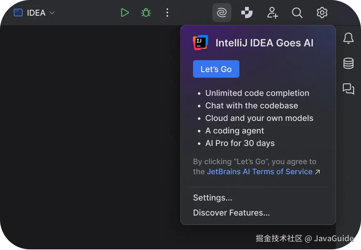 从 2025.1 IDE 版本开始,在 IDE 的右上角菜单中找到 JetBrains AI 图标,然后单击即可开始使用 JetBrains AI Free。