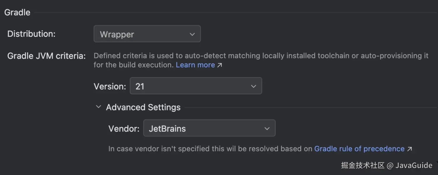 从 Gradle 8.13 开始,可以像为项目配置 JVM 一样,使用原生工具链为 Gradle Daemon 定义精确的 JVM。IntelliJ IDEA 会与 Gradle 的配置保持同步,并在需要时允许 Gradle 自动下载所需的 JVM。可以在 Preferences/Settings | Build Tools | Gradle 中轻松管理这些设置,IDE 将与 Gradle 的配置完全一致。