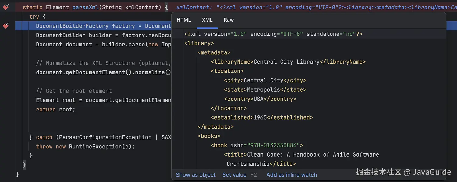 调试时检查包含标记文本(如 XML)的值时,现在会以格式化形式显示,而不是冗长的纯字符串。