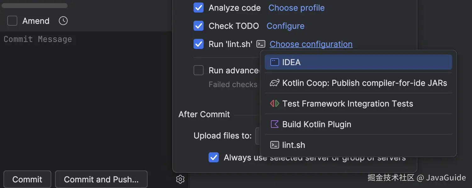 可将任何自定义工具配置为运行配置,在提交前的检查阶段(与 IDE 内置检查、格式化并行)执行。