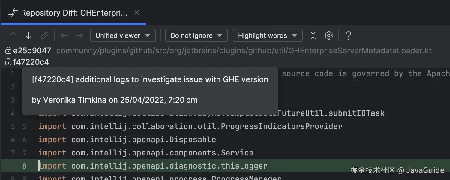 可以直接在差异视图中查看提交详情。差异对话框会显示提交信息、作者、日期时间以及完整的提交哈希值。这使您能够更清晰地了解文件的历史记录,加速对代码修改的理解。