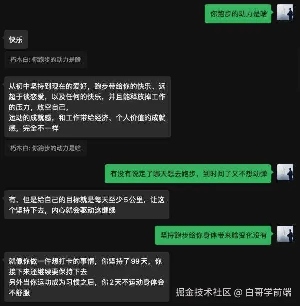 某个刷手机的深夜,被一个朋友大汗淋漓冲过终点线的照片刺痛。于是我决定这个朋友探讨一下是什么让他能坚持跑完的。本来我俩是关系都比较友好的朋友,但是我一本正经的做起了采访: