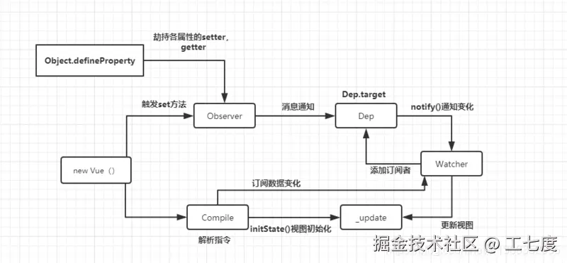- observer:利用Object.defineProperty,实现observer,将要监控的对象的所有属性都添加上get和set方法,给每一个属性都定义dep对象=>subs->[watcher1,watcher2]。这样对象的属性发生改变的时候,就会触发相应的set,发布一个通知出来,订阅这个消息的watcher就需要收到消息、触发回调函数