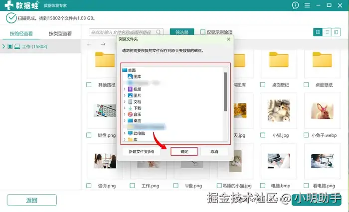 步骤3:在“浏览文件夹”的弹窗中选择电脑存放文件的位置,选好后点击“确定”。