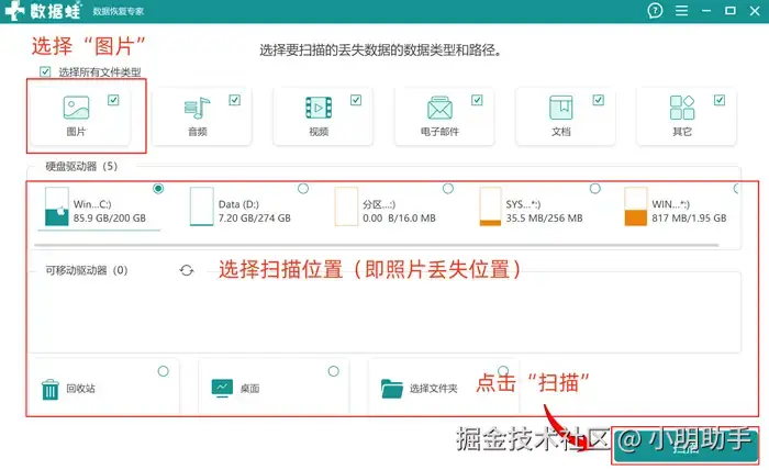 步骤1:在软件中选择“图片”和照片丢失的位置,勾选完成后点击“扫描”;