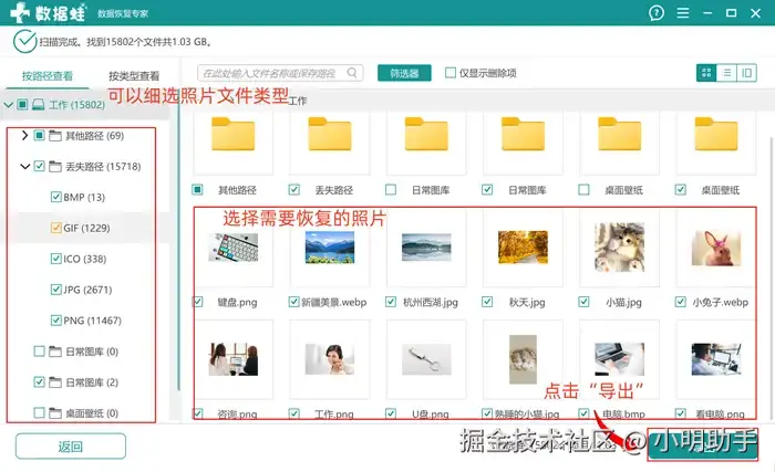 步骤2:耐心等待软件完成扫描后,可以在软件的页面上根据缩略图选择需要恢复的照片,点击后表示勾选,点击“导出”;