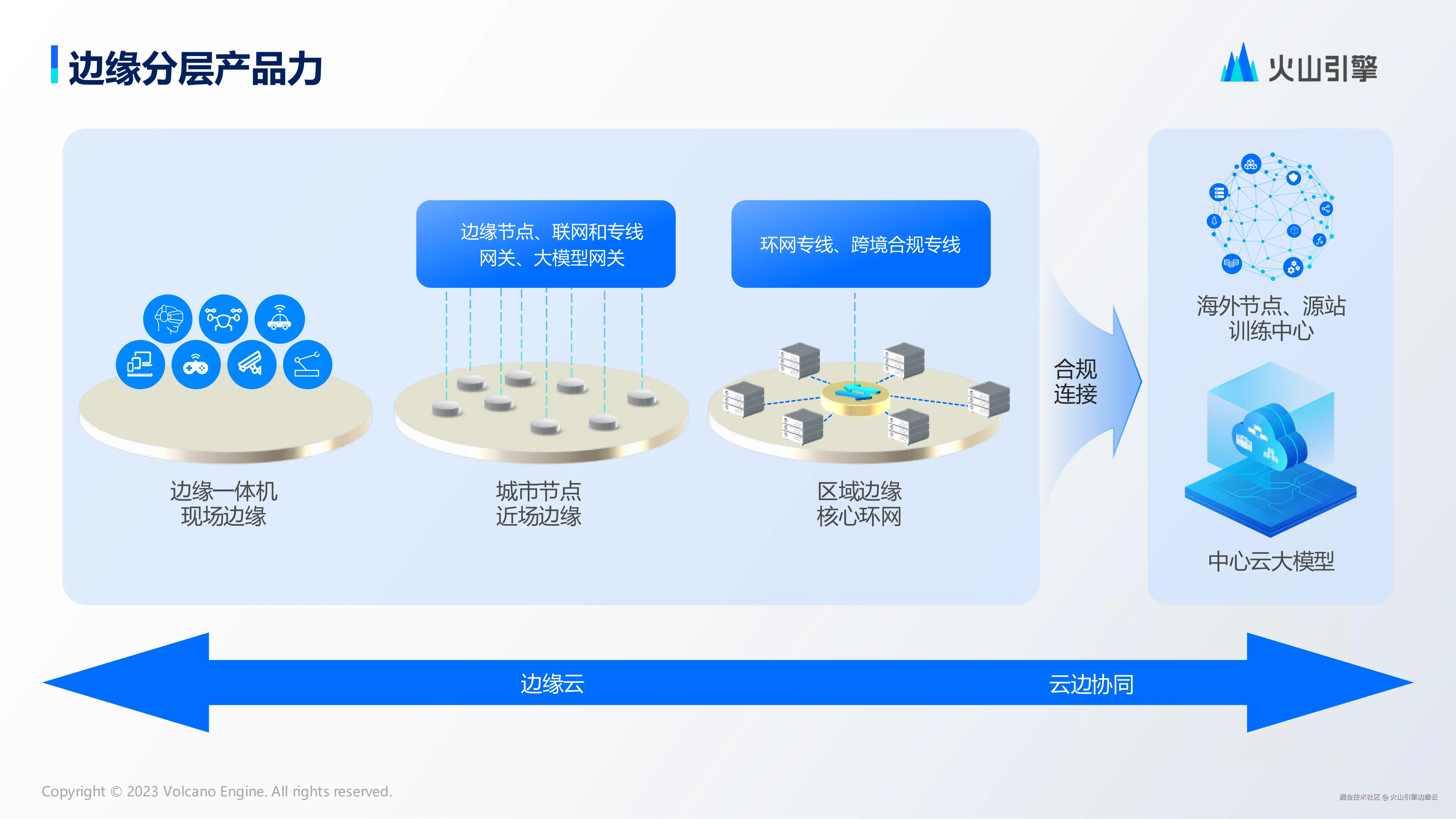 **在区域边缘层,**我们构建了核心环网,沿南北骨干网络部署区域级枢纽节点,支持专线接入,高速互联环网。通过与火山引擎云中心的无缝对接,实现边缘侧 TOS 存储等核心业务的云边端协同。同时提供国际合规化专线服务,满足业务国际化需求。