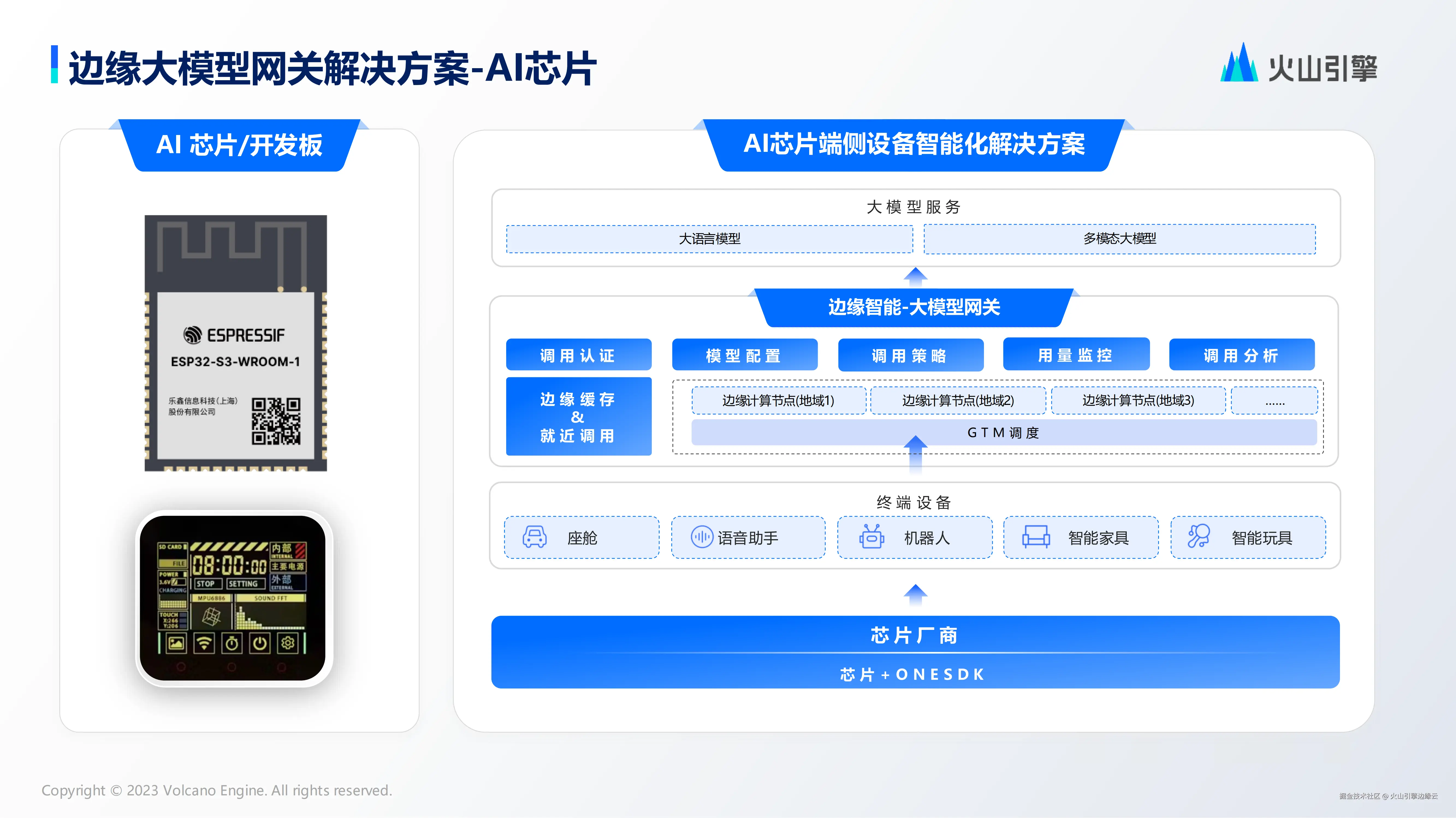 针对芯片场景,火山引擎边缘大模型网关推出端智能实例及一站式 OneSDK 解决方案,助力厂商快速对接边缘大模型网关,实现多模型兼容与智能体灵活调用,目前在智能玩具、教育终端等陪伴类场景实现规模化落地。