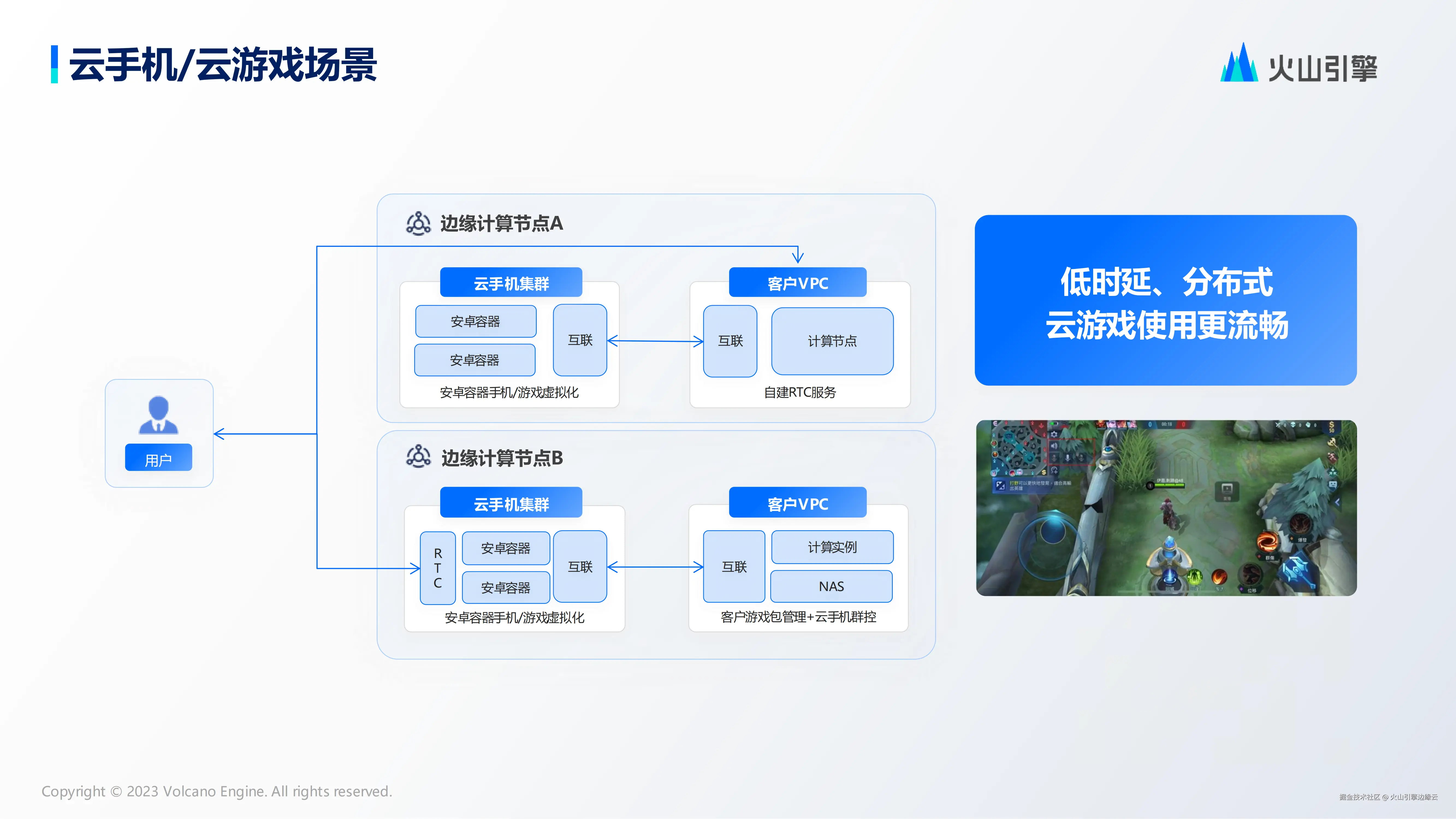 针对云手机/云游戏场景,火山引擎边缘计算依托异构算力实现安卓容器化,通过 RTC 流化传输与全球智能调度,就近部署云手机/云游戏服务,保障低延迟体验。同步开放边缘节点资源与异构算力,支撑云手机、云游戏供应商快速落地多样化场景。