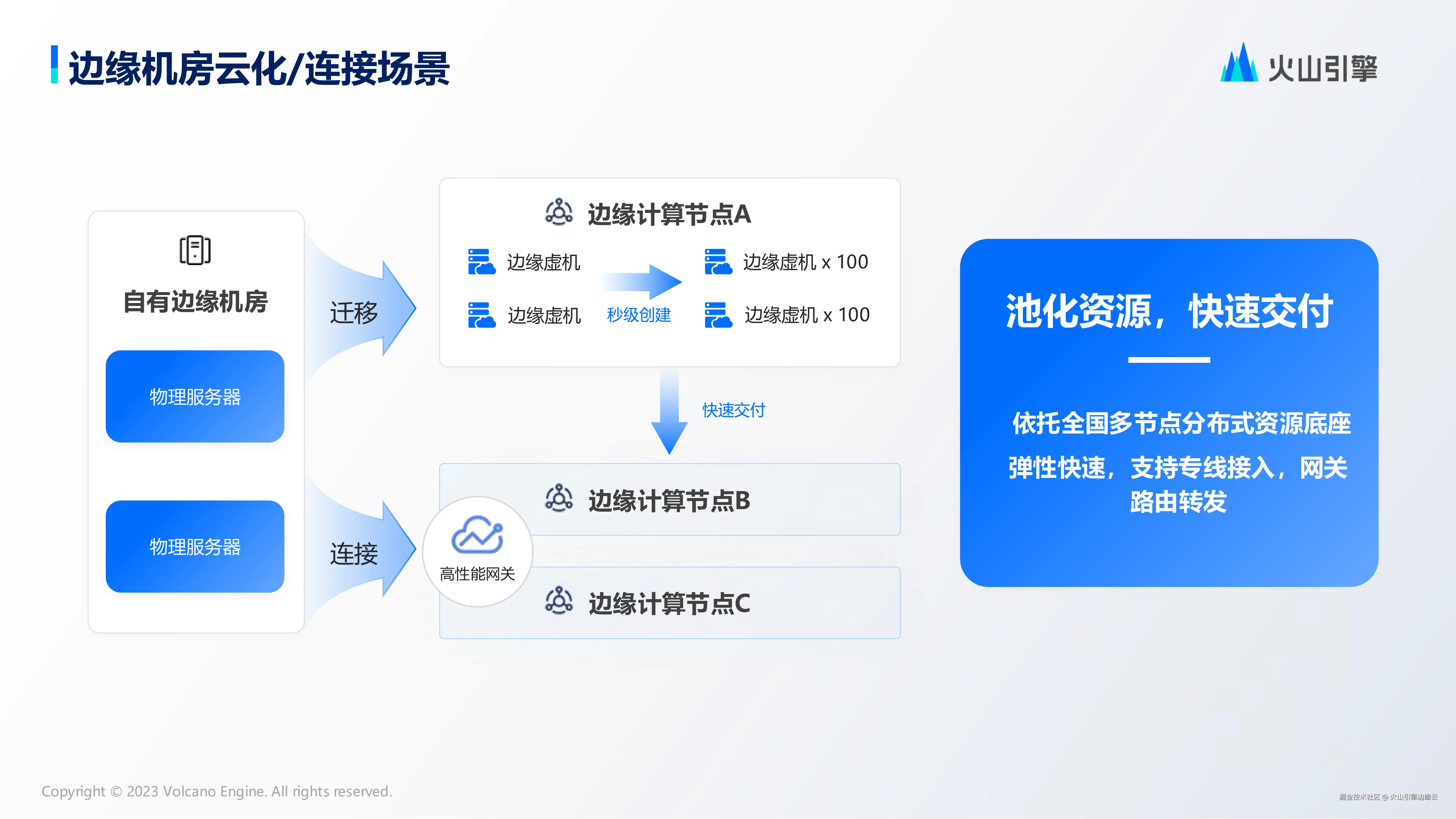 针对机房的云化和连接,考虑到服务器自持有一定生命周期,更新换代也比较快的情况,火山引擎边缘计算提供边缘云化解决方案,支持老旧服务器无缝迁移至边缘节点或通过网关接入,通过秒级弹性部署算力池,灵活适配业务周期,实现有效降低运维成本。