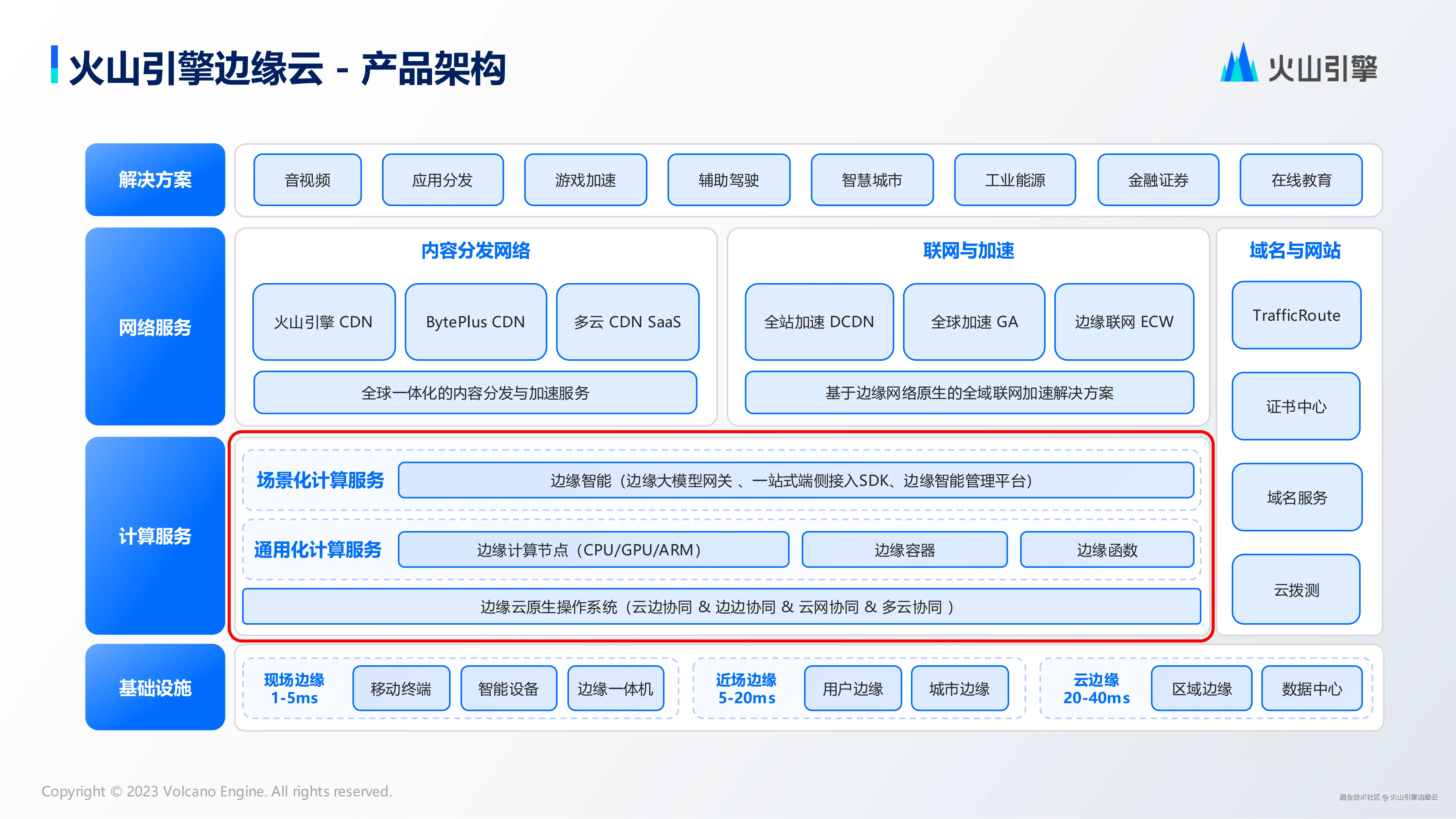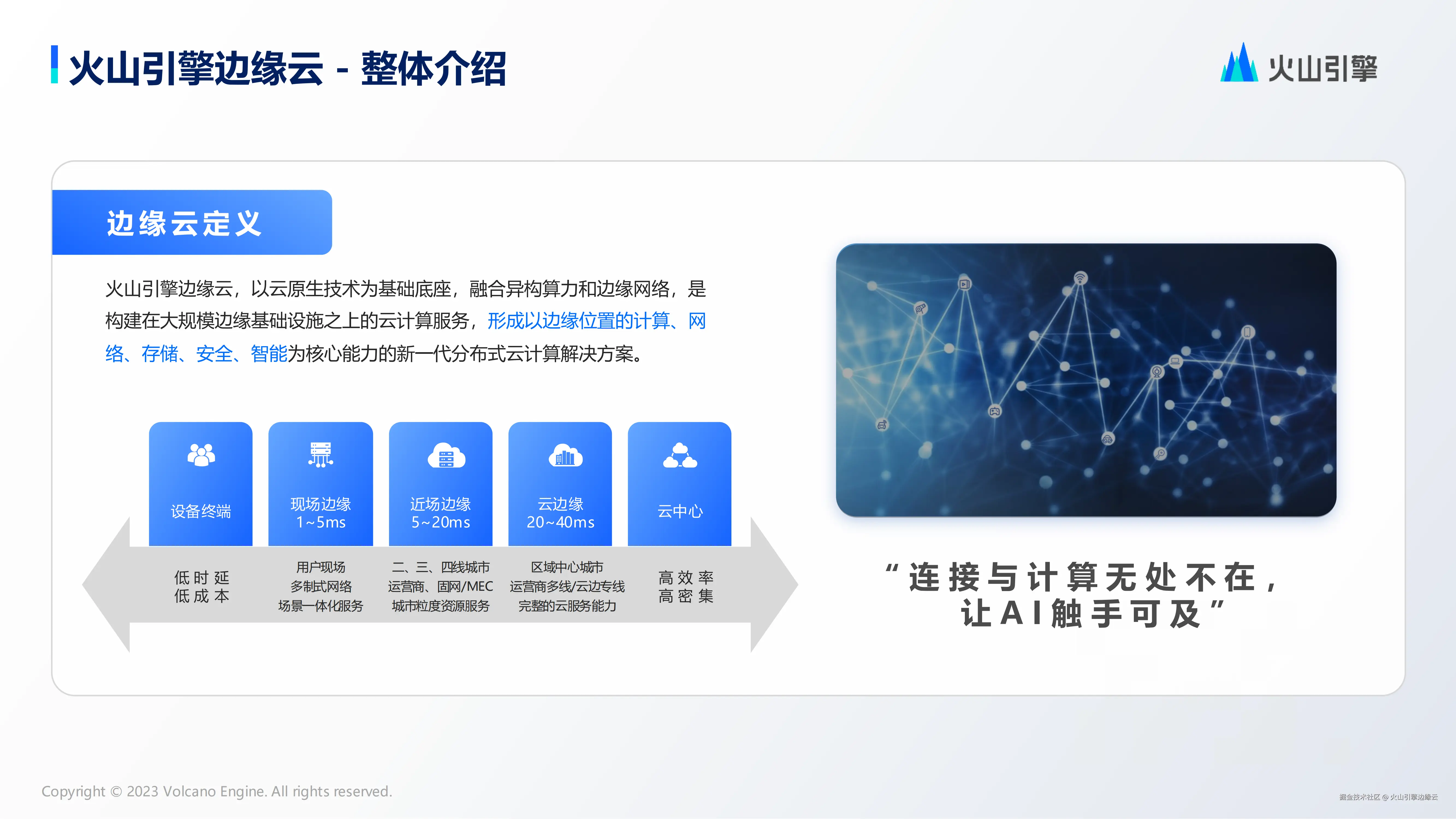 火山引擎边缘云以云原生技术为基础底座,融合异构算力和边缘网络,是构建在大规模边缘基础设施之上的云计算服务,并提供以边缘位置的计算、分发、网络、存储、安全、智能为核心能力的新一代分布式云计算解决方案。通过在设备终端、现场边缘、近场边缘、云边缘、云中心之间构建计算与网络的分层连接,覆盖1-40ms超低延时场景需求,致力于实现:“连接与计算无处不在,让 AI 触手可及”。