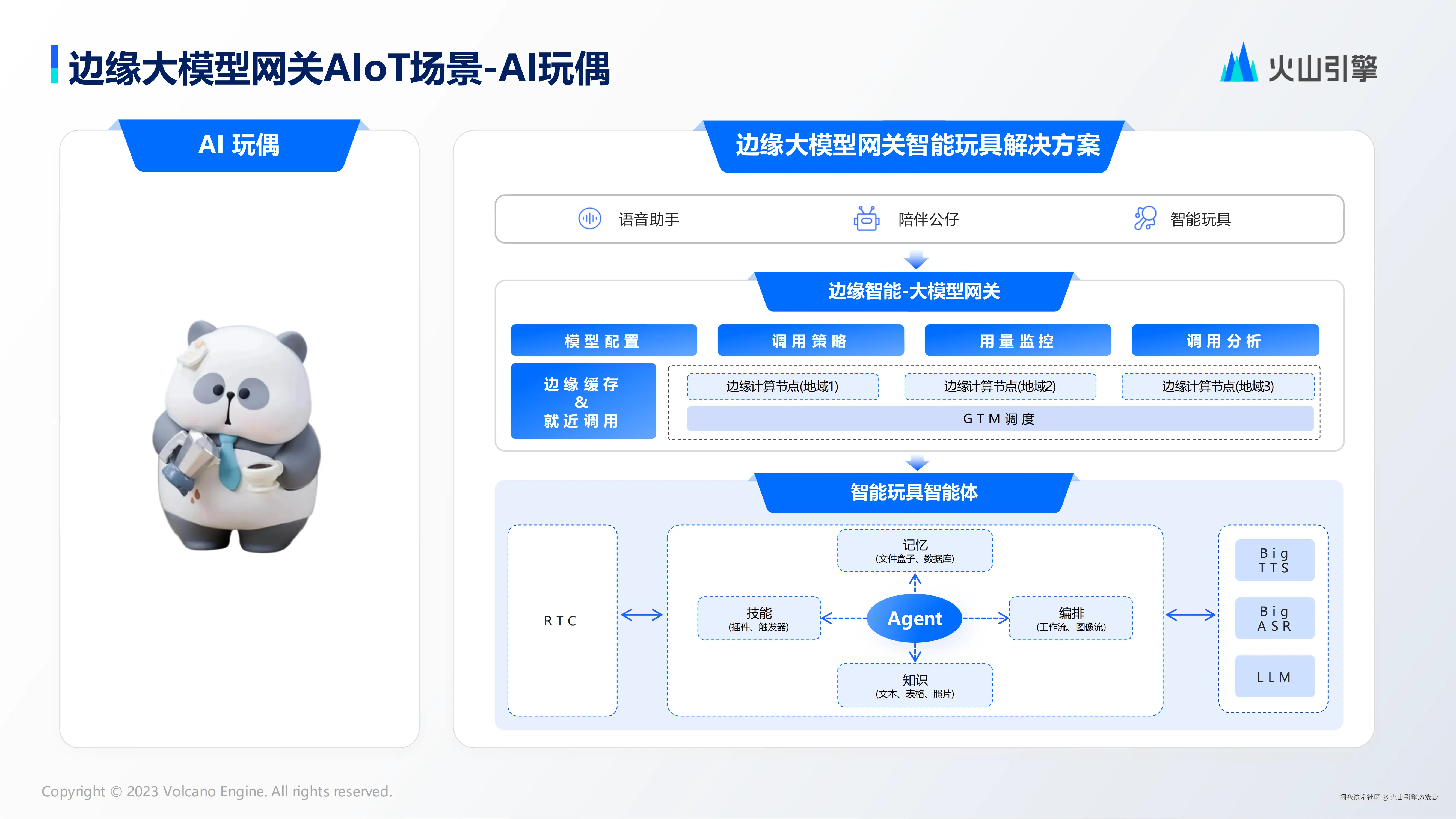 **针对 AI 玩偶场景,**火山引擎边缘大模型网关推出智能玩具解决方案,通过统一 API 接口接入,并实现多节点智能调度,支持多样化 AI 模型与智能体快速接入。基于 WebSocket 实时通信协议与智能调度系统深度融合,赋能玩具等陪伴类终端设备实现快速智能化改造,助力传统硬件升级为 AI 边缘载体,显著提升创新效率。