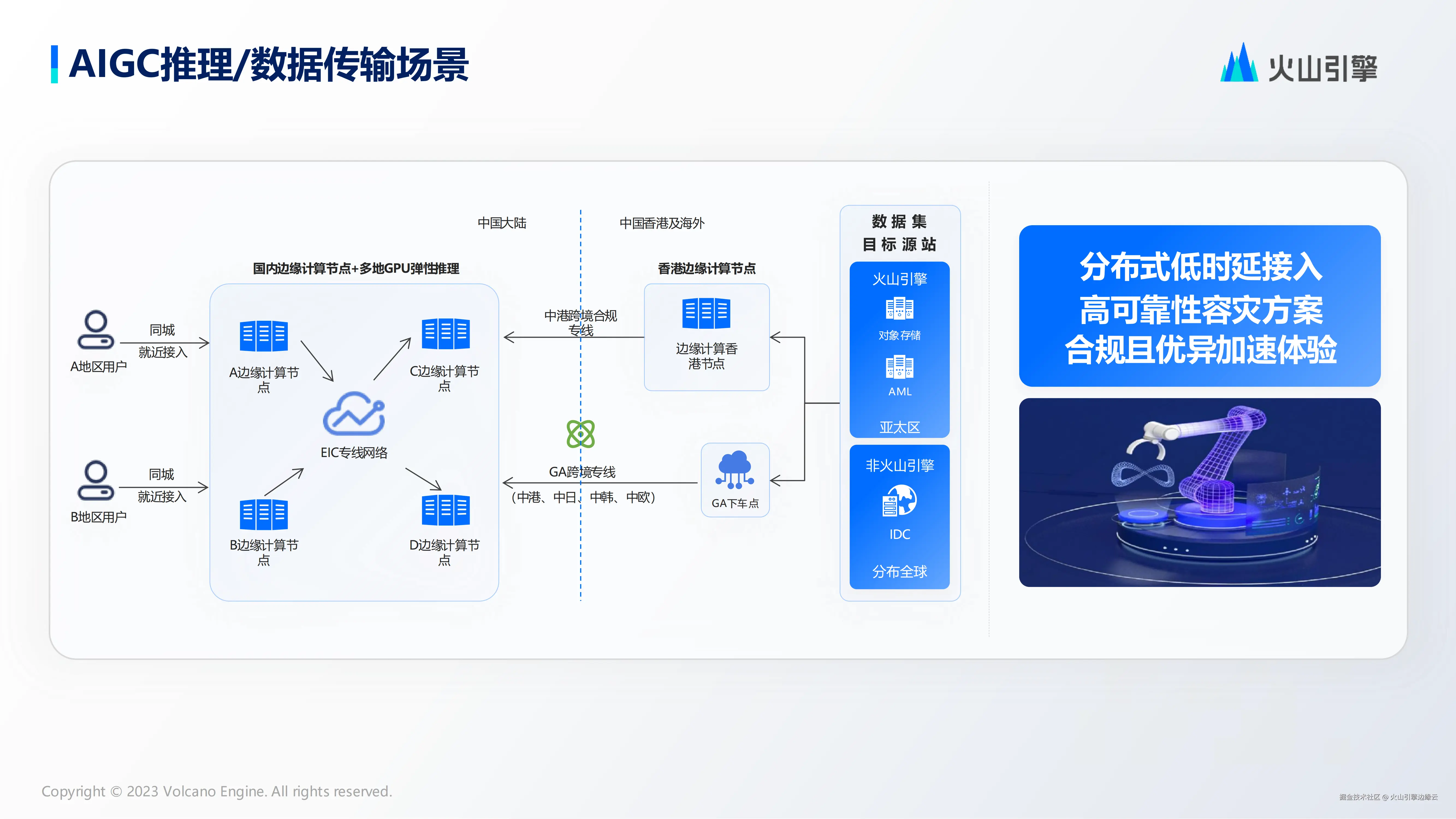 针对 AIGC 推理/数据传输场景,火山引擎边缘计算能够基于边缘计算节点和全球合规专线,结合全球加速平台,为用户提供安全、合规、可靠的就近接入和跨域传输加速服务,保证分布式低时延接入,同时通过高可靠性容灾方案,确保合规、优异的加速体验。