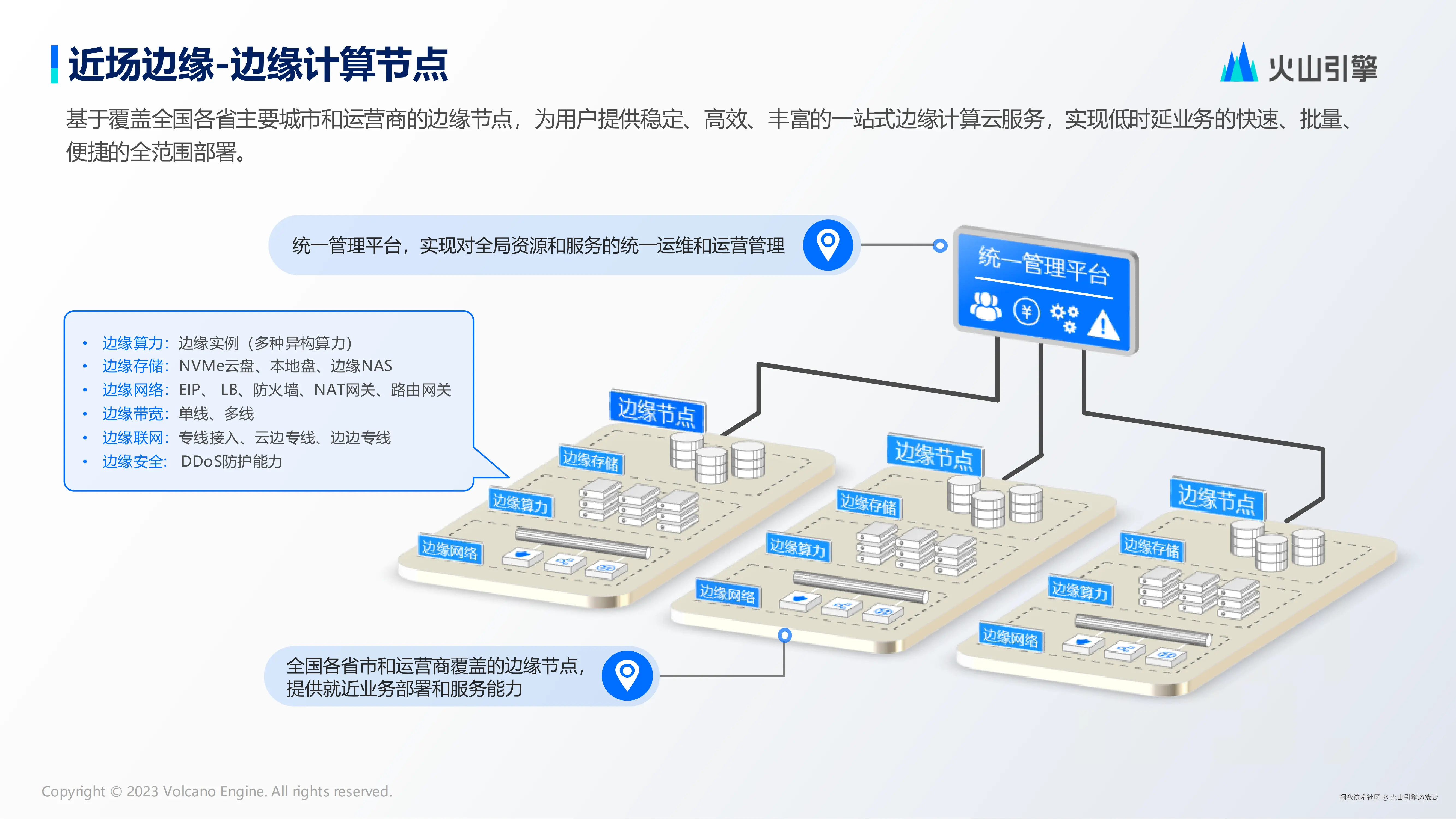 此外,针对近场边缘场景,我们提供一站式边缘计算平台,基于多种边缘异构算力、存储能力和网元能力,结合网关和专线快速接入,实现云边和边边的高速专线连接,并提供可靠的 DDoS 防护能力,实现在全国各区域构建一张核心环网和提供多层次的分布式算力。