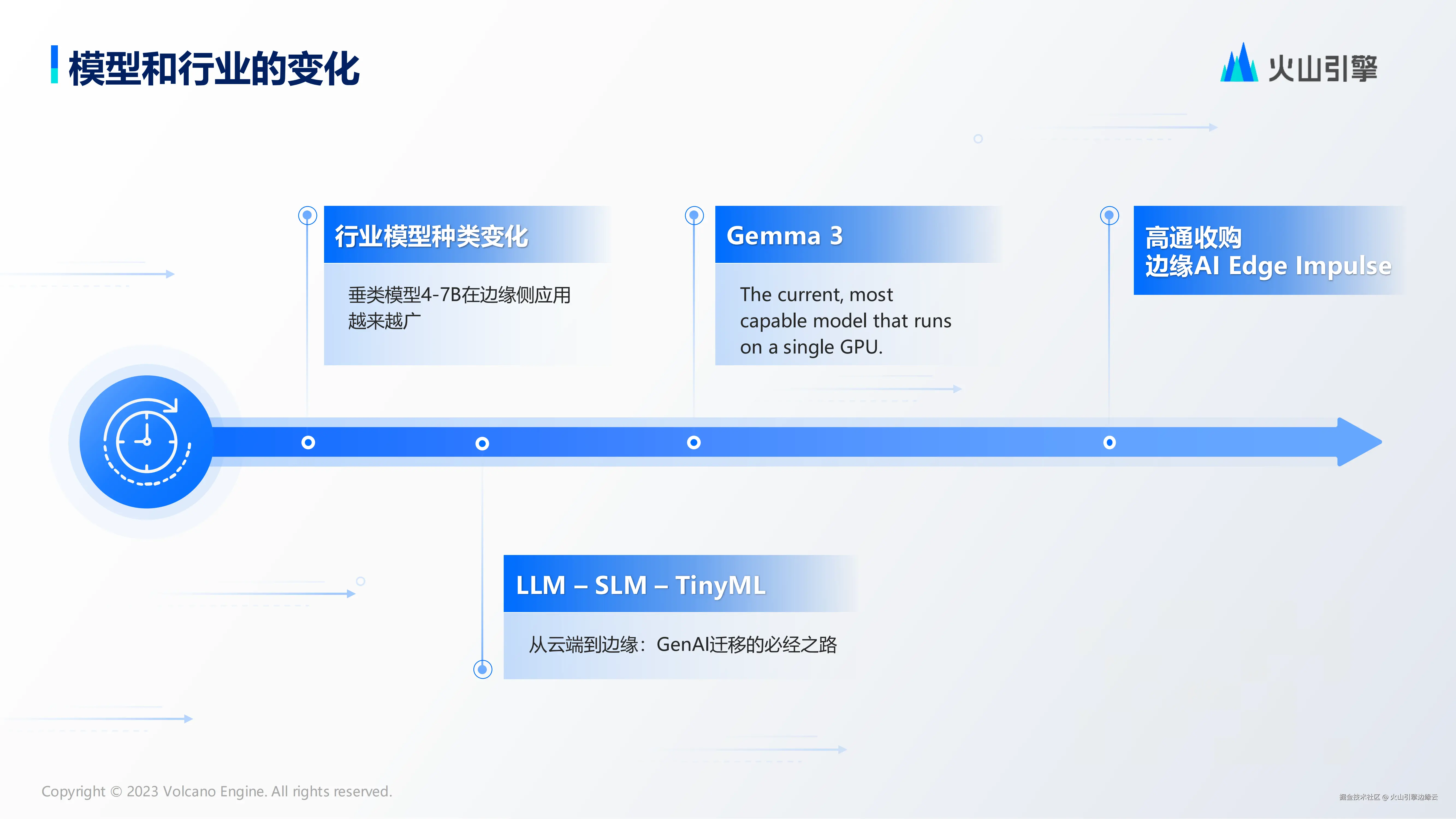 近期,行业格局呈现的变化值得我们关注。从技术演进脉络来看,垂直领域模型与小参数模型数量显著增长,其中 4-7B 参数的垂类模型在边缘侧应用范围持续扩大;值得关注的技术突破包括 Gemma 3 模型的发布,其单 GPU 部署能力有效降低了硬件门槛;行业整合方面,以高通收购边缘 AI Edge Impulse 最具代表性。纵观全局,从大语言模型到小参数模型,再到 Tiny 级微架构,模型部署正呈现出从云端向边缘端迁移的显著趋势,生成式 AI 技术正朝着多元化方向纵深发展。