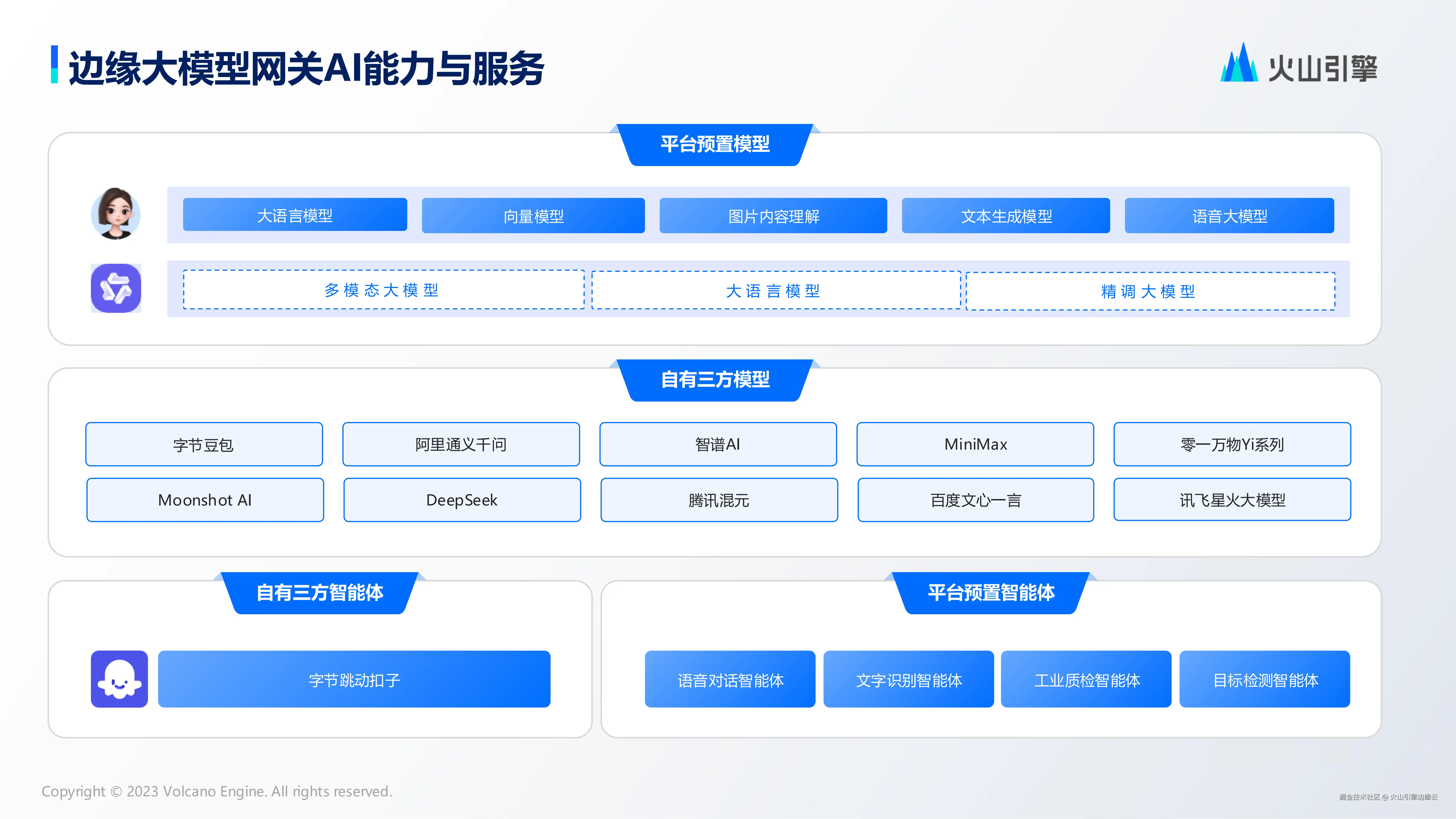 在 AI 能力和服务上,边缘大模型网关提供预置模型,包括大语言模型、向量模型、图片内容理解、文本生成模型、语音大模型等,并通过集成三方模型,满足国内外模型的适配和调用。在智能体层面,边缘大模型网关支持联动扣子自行创建智能体,同时也积累了预置智能体,包括语音对话智能体、文字识别智能体、 OCR 质检智能体、目标检测智能体等,进一步满足不同垂类场景的需求。