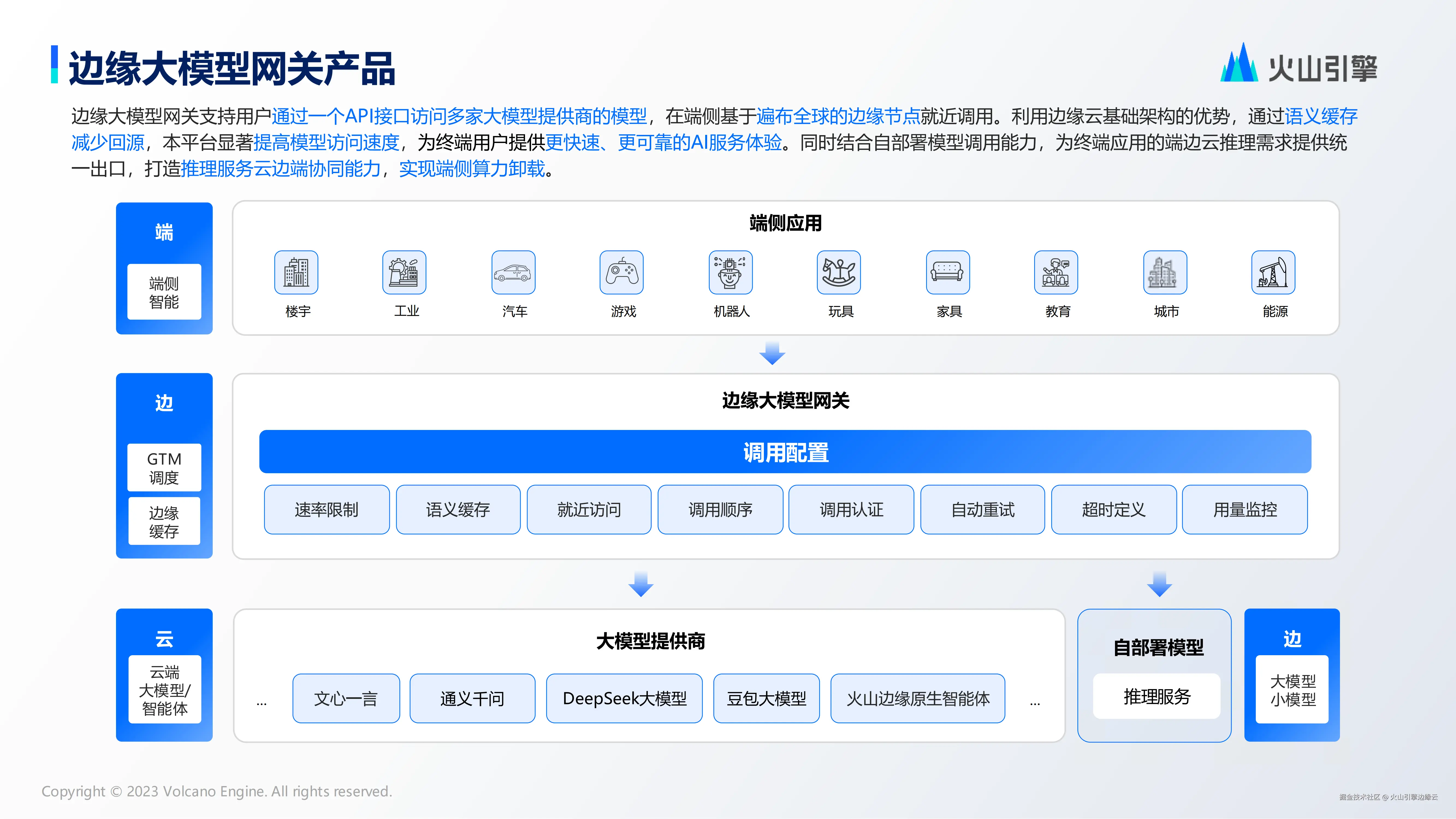 在大模型结合应用层面,我们提供边缘大模型网关产品。边缘大模型网关支持用户通过一个 API 接口访问多家大模型提供商的模型,在端侧基于遍布全球的边缘节点就近调用。利用边缘云基础架构的优势,通过语义缓存减少回源,平台显著提高模型访问速度,为终端用户提供更快速、更可靠的 Al 服务体验。同时结合自部署模型调用能力,为终端应用的端边云推理需求提供统一出口,打造推理服务云边端协同能力,实现端侧算力卸载。