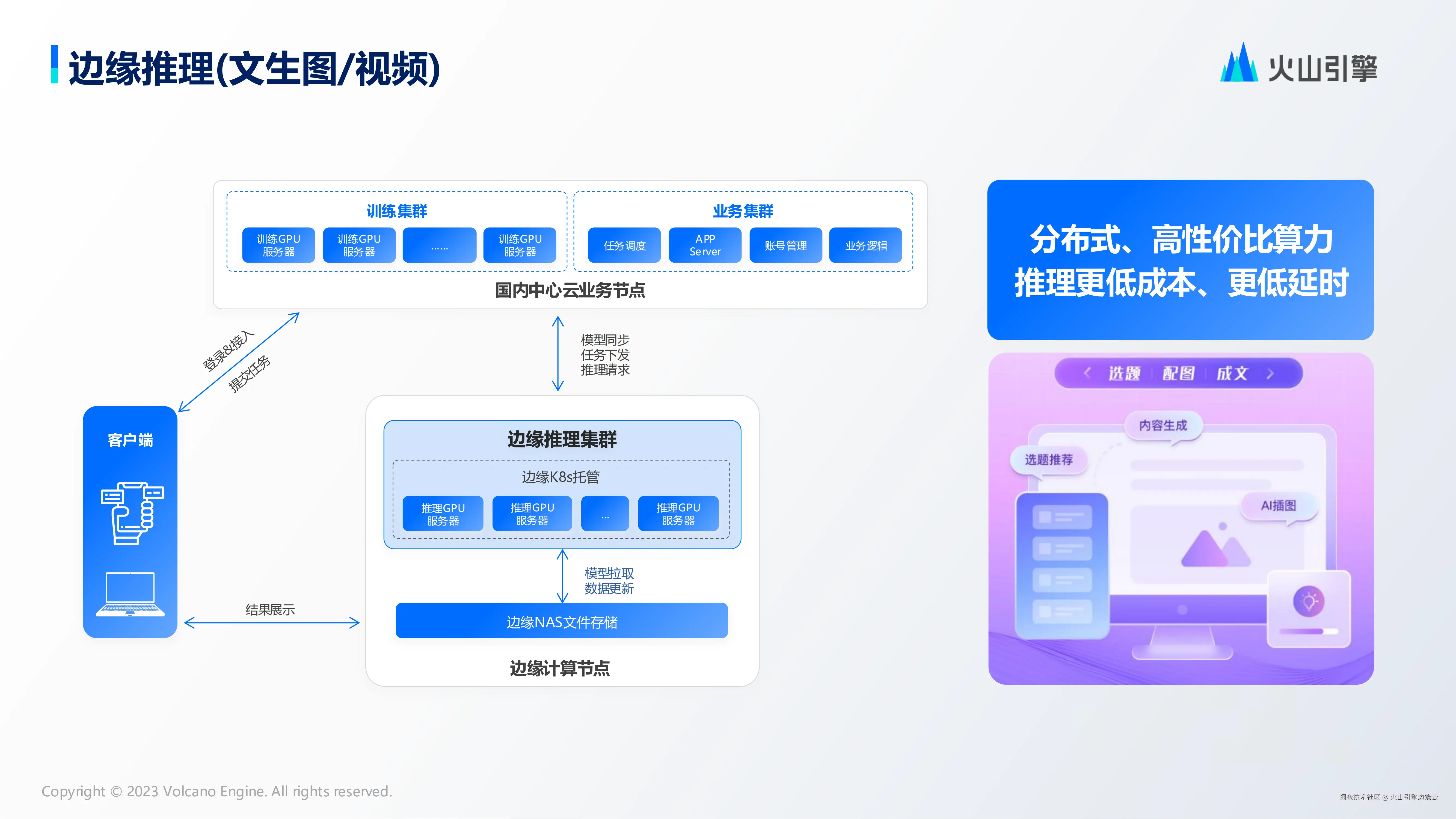**针对边缘推理场景,**火山引擎边缘计算构建分布式推理集群,并通过 K8s 来管理和调度边缘算力,当用户提交请求任务时,中心平台可以基于用户的地理位置,将请求调度到靠近用户的边缘节点,实现推理的高效反馈。同时,边缘 NAS 可以存储不同的模型和数据,在文生图和文生视频场景上通过提供高性价比的算力和网络资源,实现更低延时的推理效果。