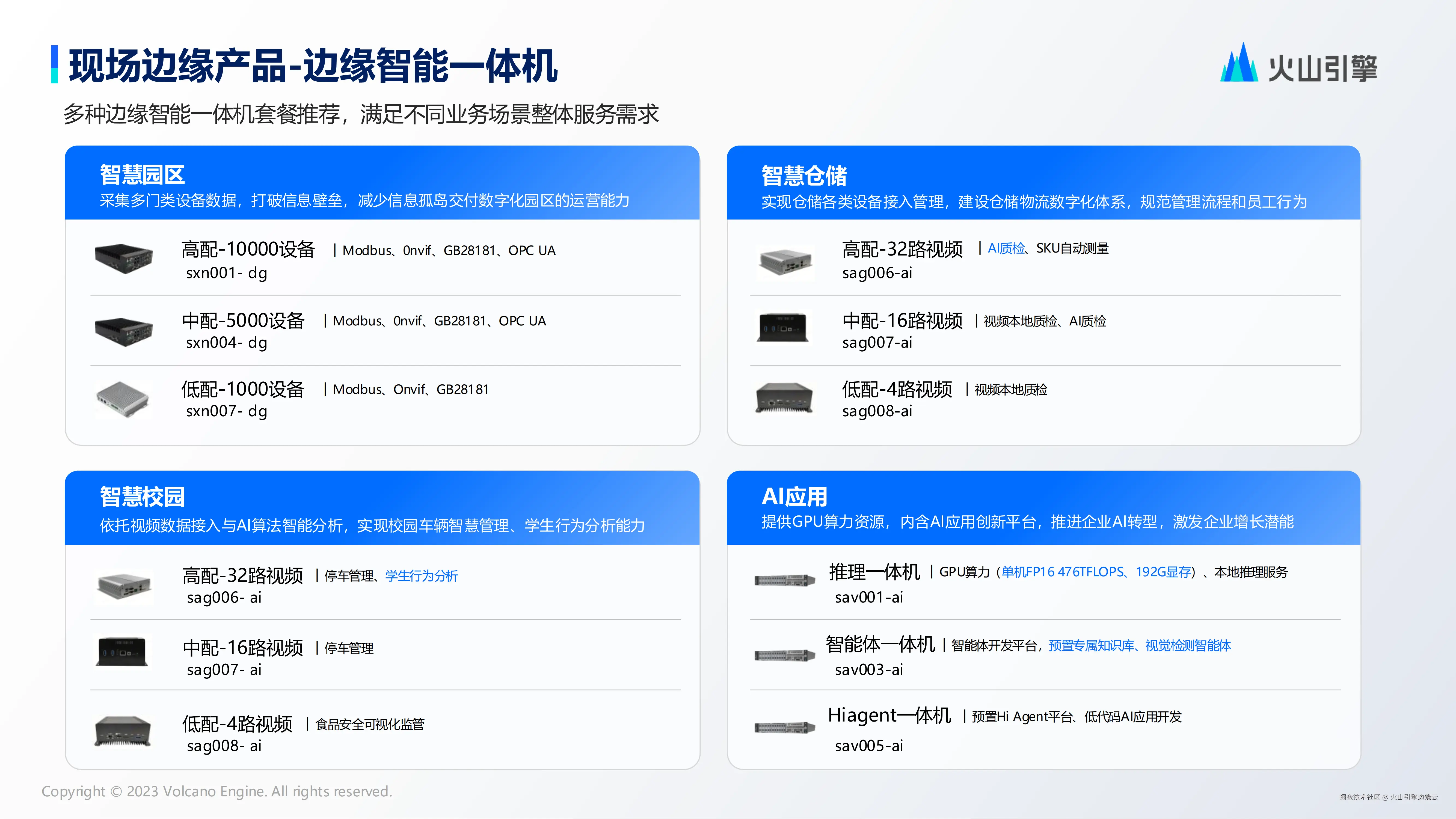 针对现场边缘场景,我们提供多种边缘智能一体机套餐,满足如智慧园区、智慧仓储、智慧校园、AI 应用等不同业务场景整体服务需求: