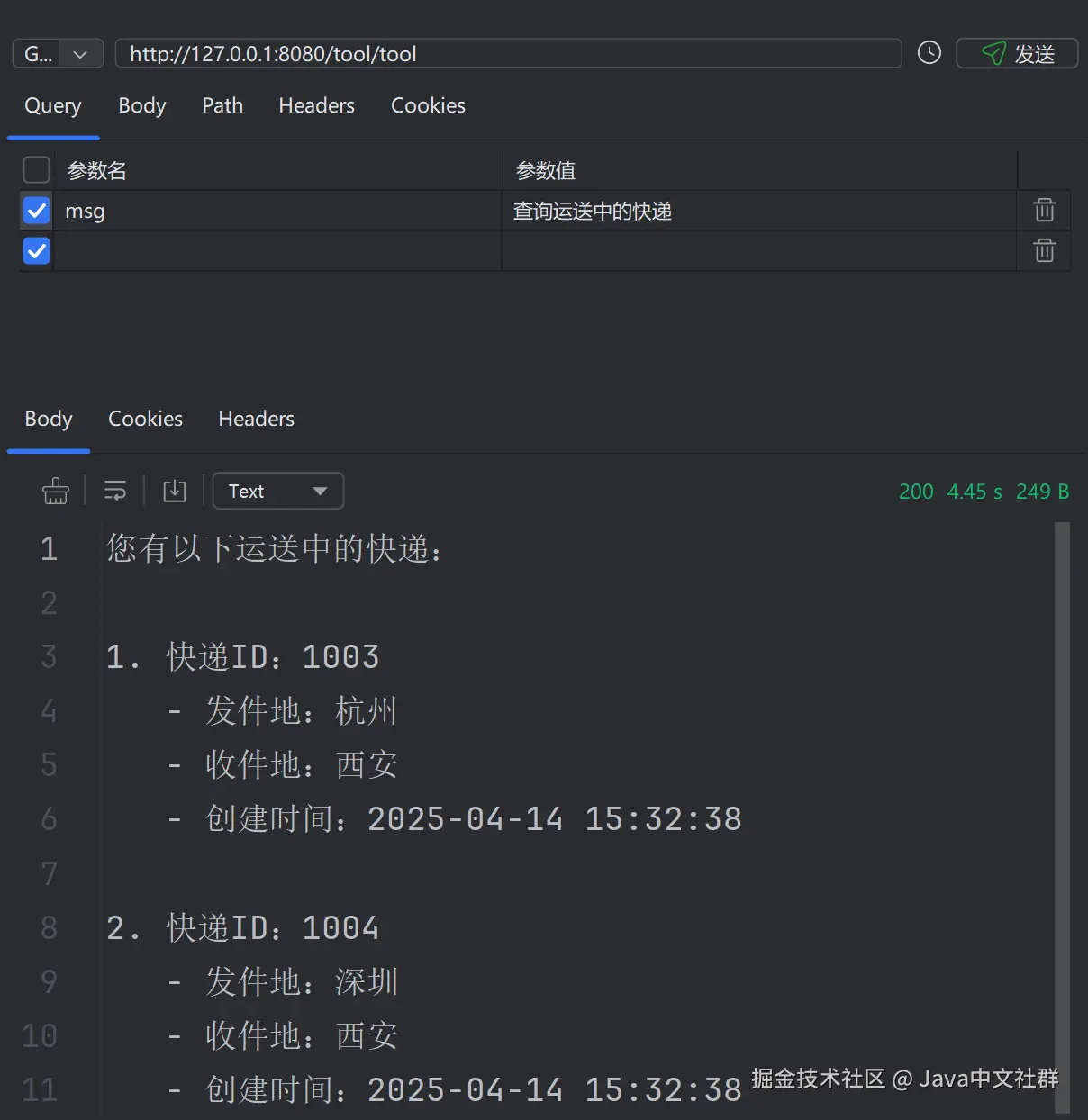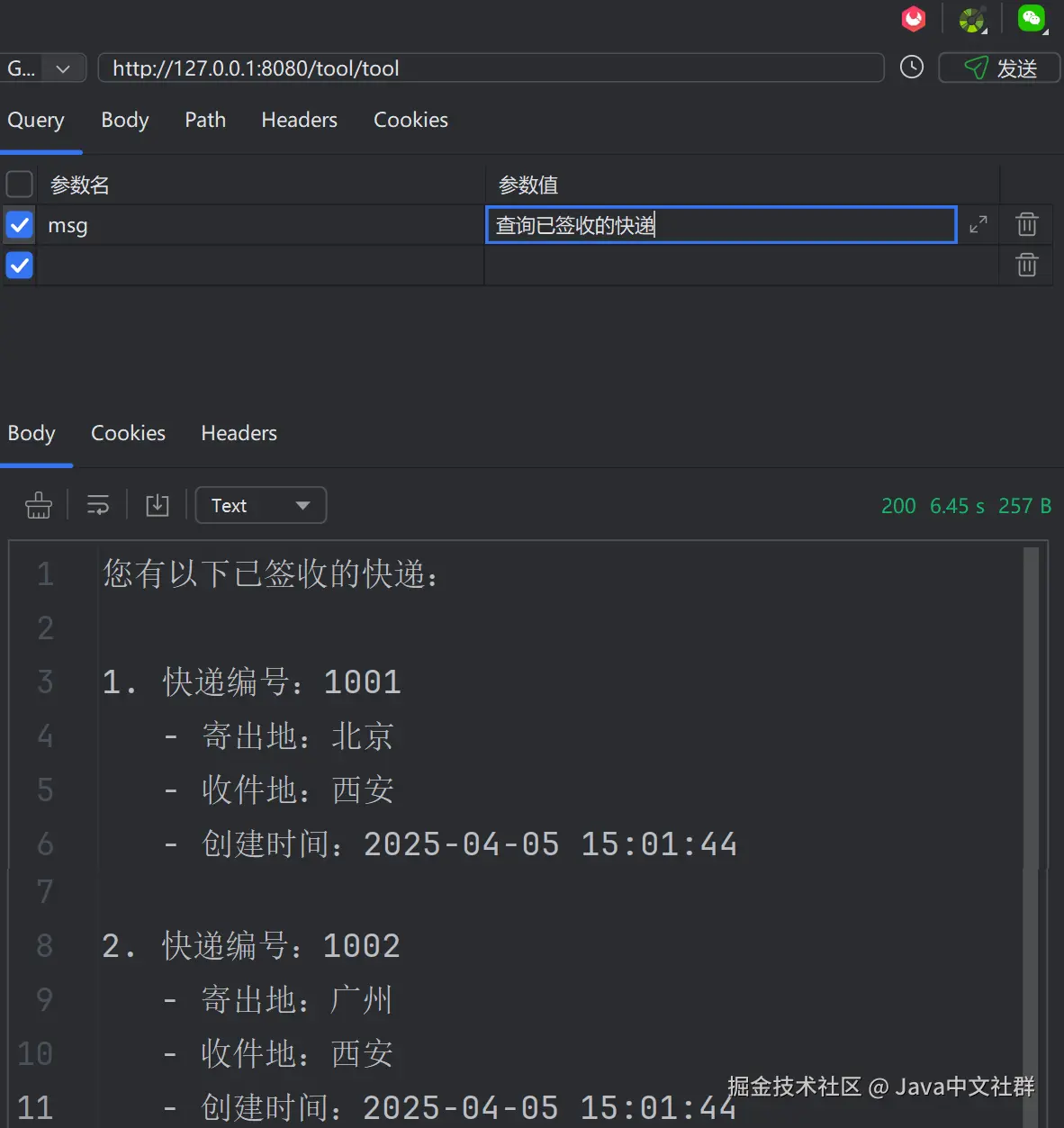 @Tool(description = "用于查询我的快递")