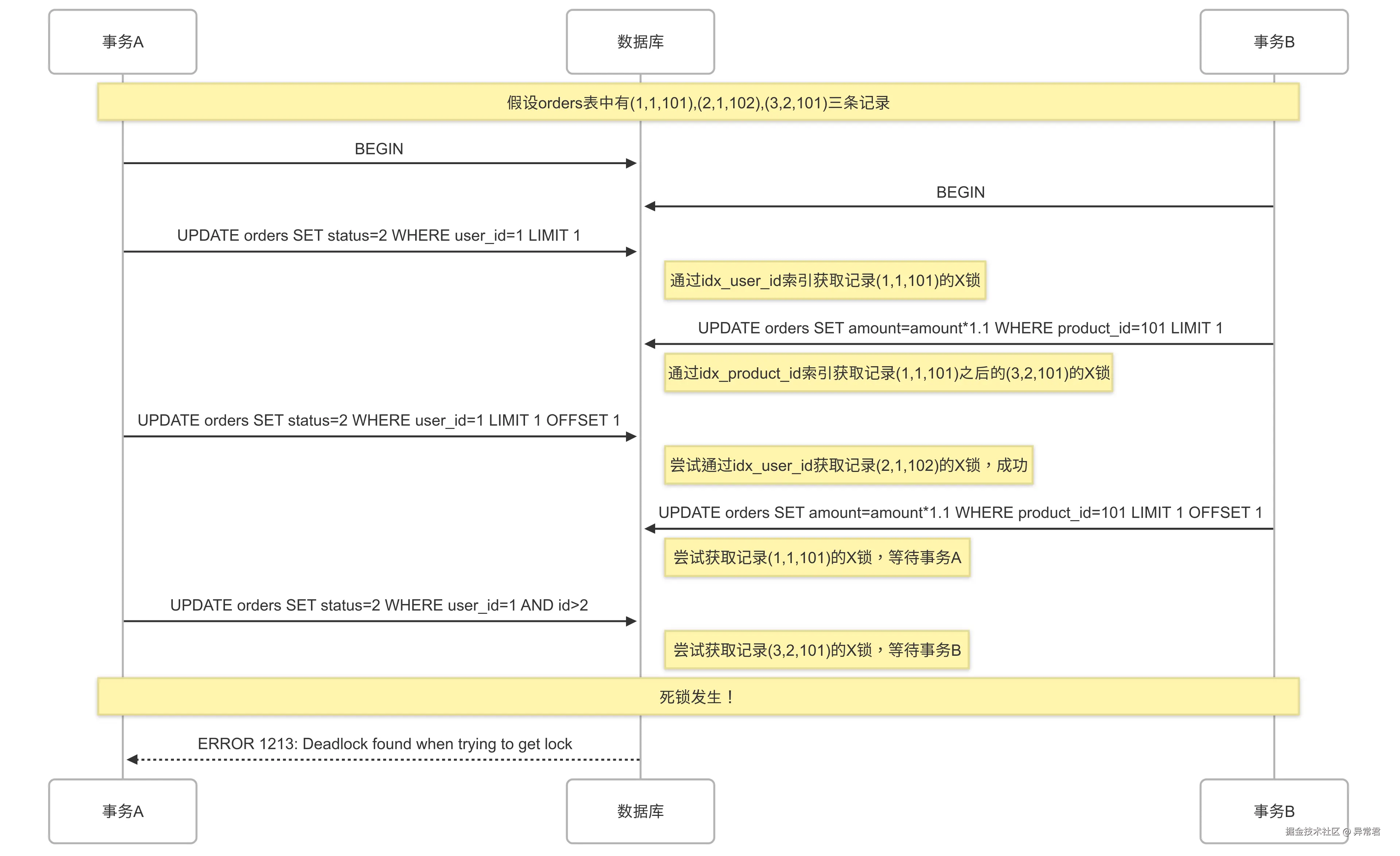 这里需要注意一个重要点:InnoDB 的行锁是通过索引实现的。在这个案例中,事务 A 使用user_id索引,事务 B 使用product_id索引,导致锁定的记录顺序不同,增加了死锁风险。如果查询条件未命中索引,情况会更糟,可能导致表锁或大范围的临键锁。