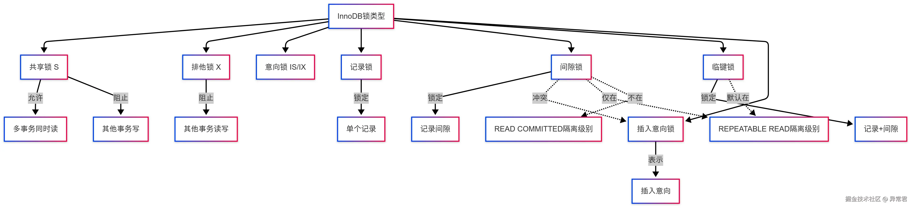 需要特别强调的是:间隙锁和临键锁只在 REPEATABLE READ 隔离级别下默认生效。在 READ COMMITTED 隔离级别下,InnoDB 不使用间隙锁,临键锁会退化为记录锁,这是减少死锁的重要知识点。
