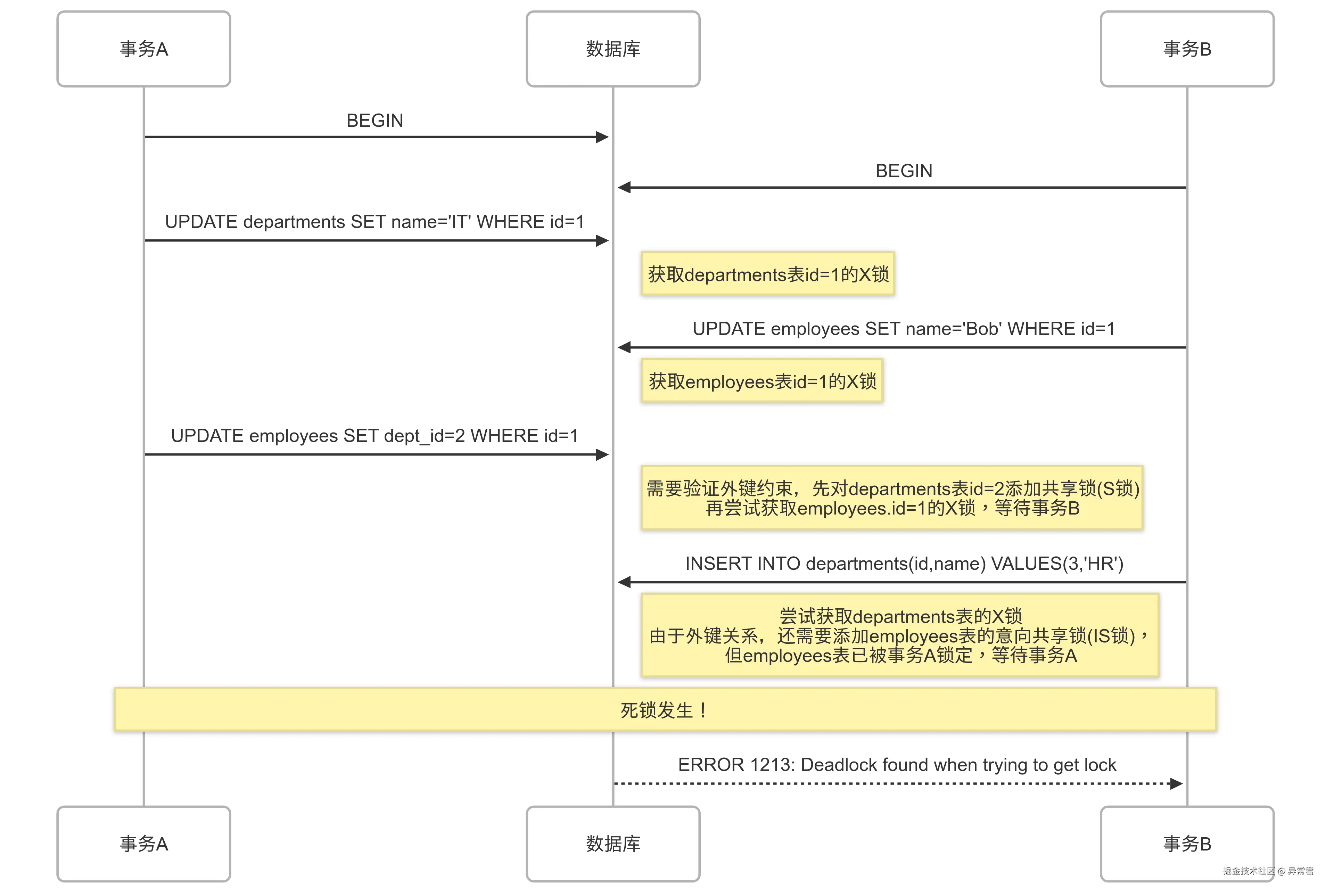 死锁就像两个人互相给对方让路,结果谁都动不了的尴尬局面。在数据库中,当两个或多个事务互相等待对方释放锁,导致所有事务都无法继续执行时,就形成了死锁。