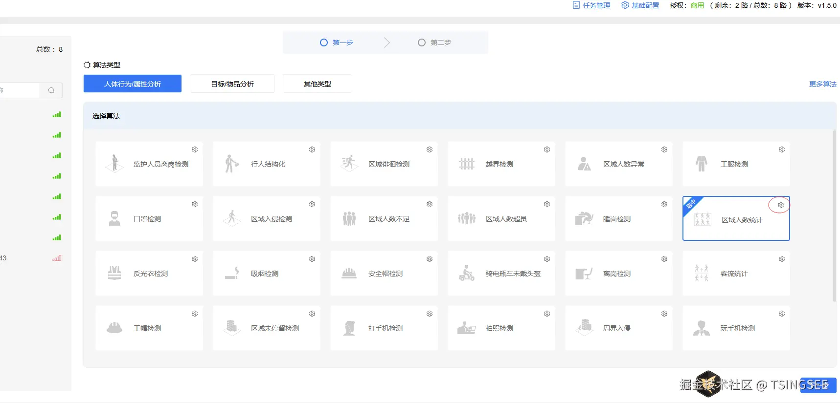 - **算法丰富:**内置近40种AI算法模型,涵盖人脸、人体、车辆、车牌、行为分析、烟火、入侵、聚集、安全帽、反光衣等多个方面,可按需组合、按场景配置,满足不同领域的多样化需求。